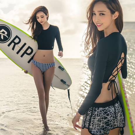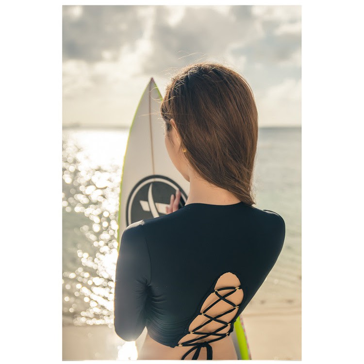 黑色交叉繫帶長袖防曬泳裝+三角泳褲+瓶口泳褲 三件式 水母衣 比基尼 橘魔法 【p0061159042003】