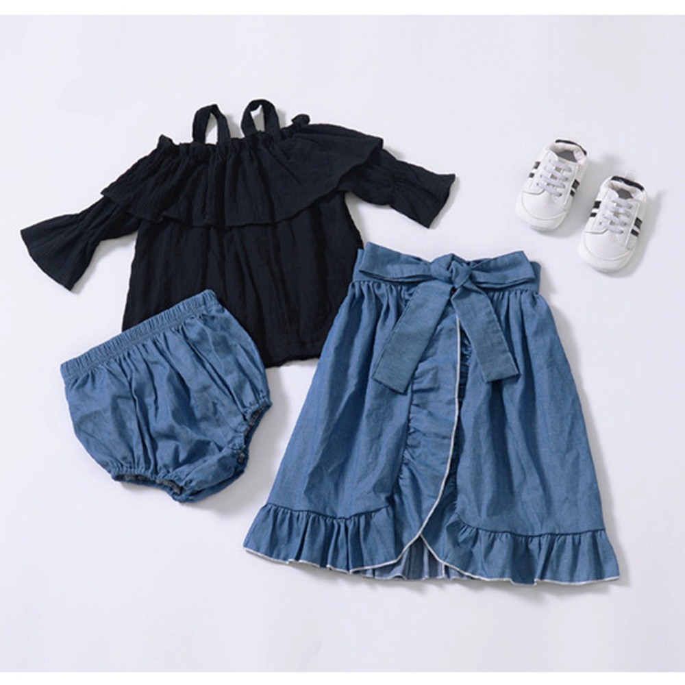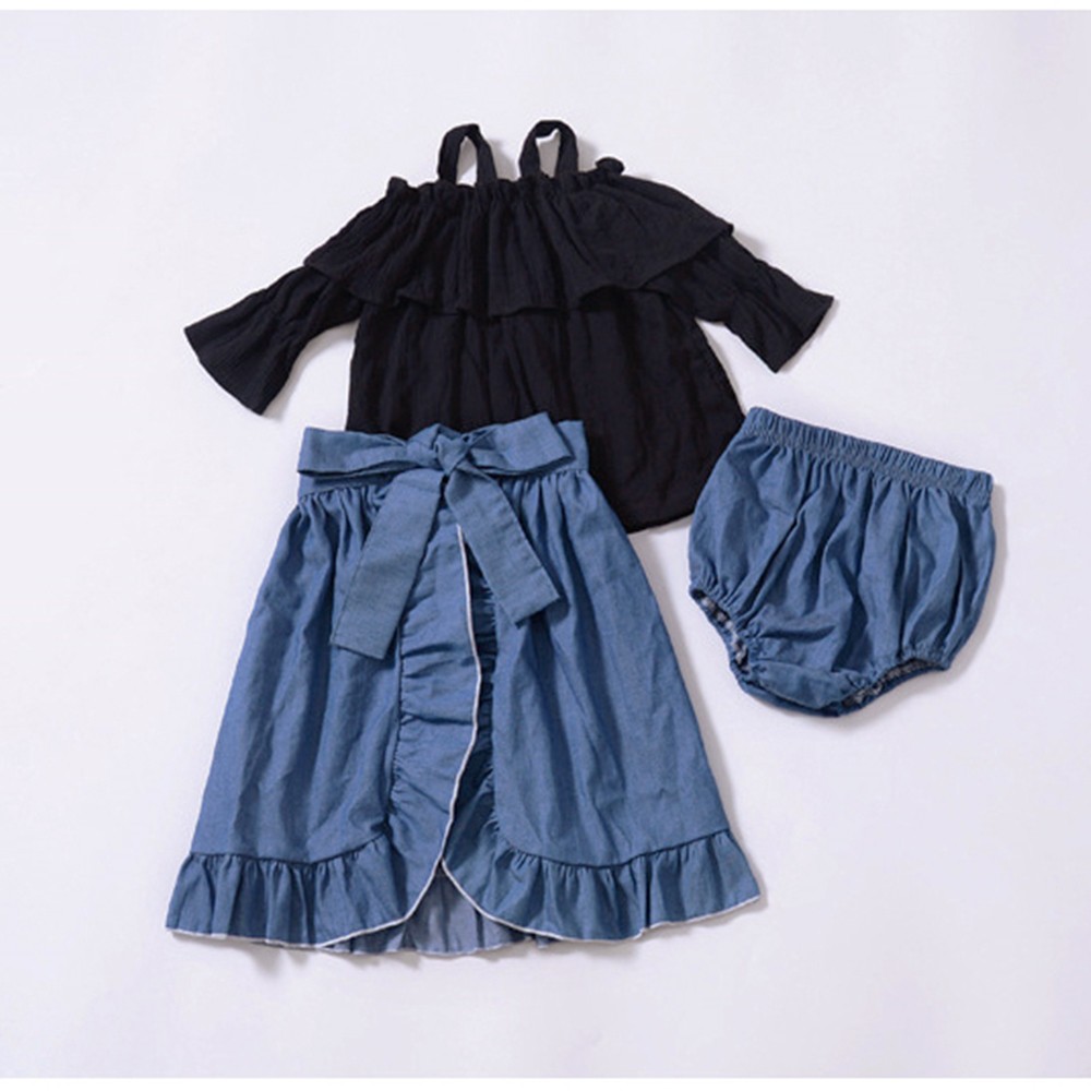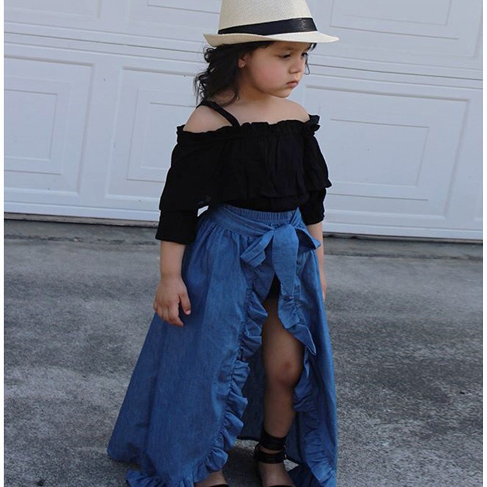 露肩棉紗牛仔荷葉長裙 套裝 3件式 半身裙 裙子 露肩上衣 無袖上衣 女童 童裝 兒童 橘魔法 現貨【BB8380】