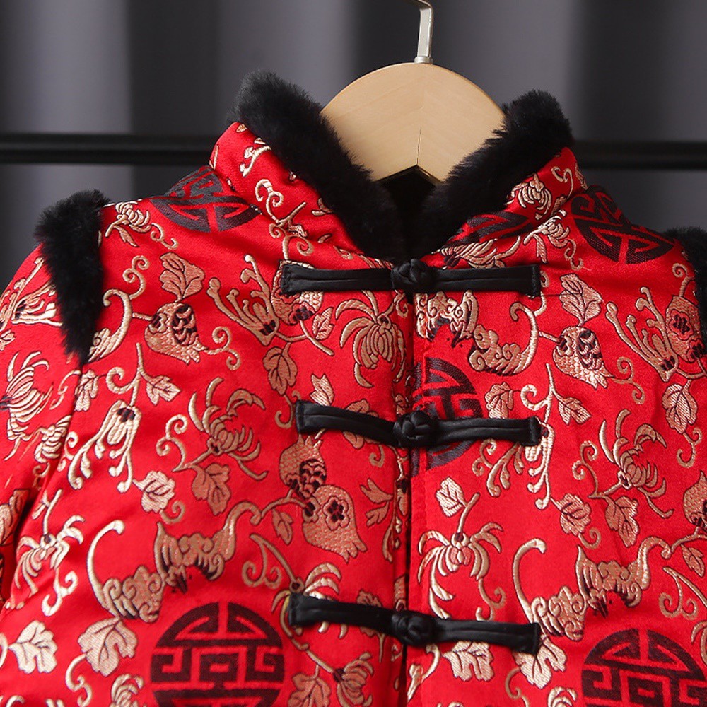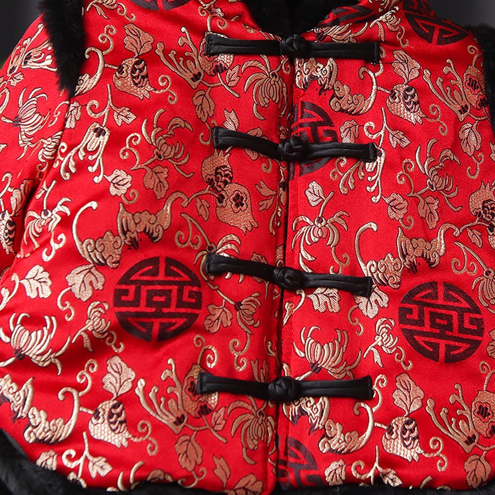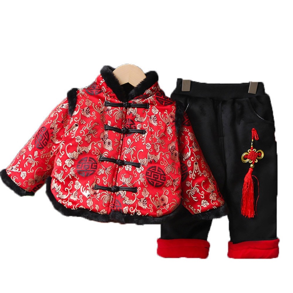 橘魔法 黑色毛邊刺繡花紋棉襖長袖上衣+刷毛長褲 附活動式中國結 套裝 拜年服 童裝 過年【p0061221353110】