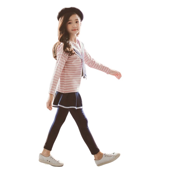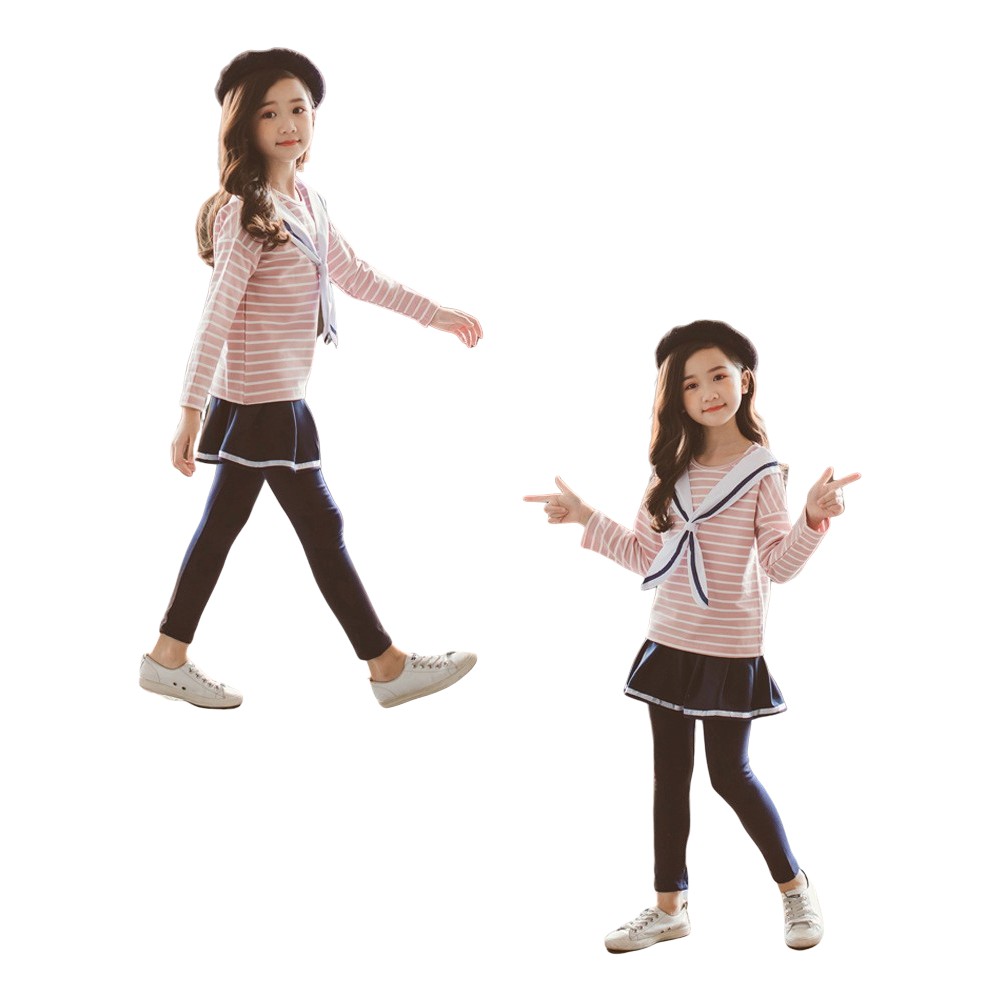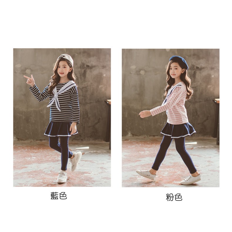 海軍風條紋上衣+褲裙 套裝 大童 條紋上衣 套裝 橘魔法 女童 現貨在台灣 兒童 童裝【BB7364】