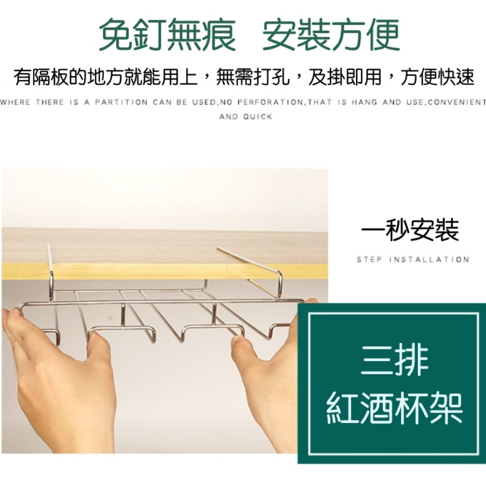 304不鏽鋼吊掛三排紅酒杯架 高腳杯架 免打孔 免釘 掛架 隔板掛架 無痕掛架 收納用品 【p006122666637】