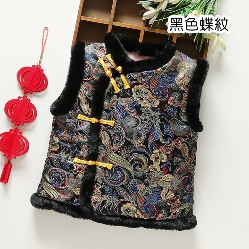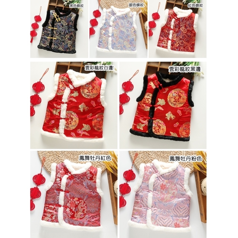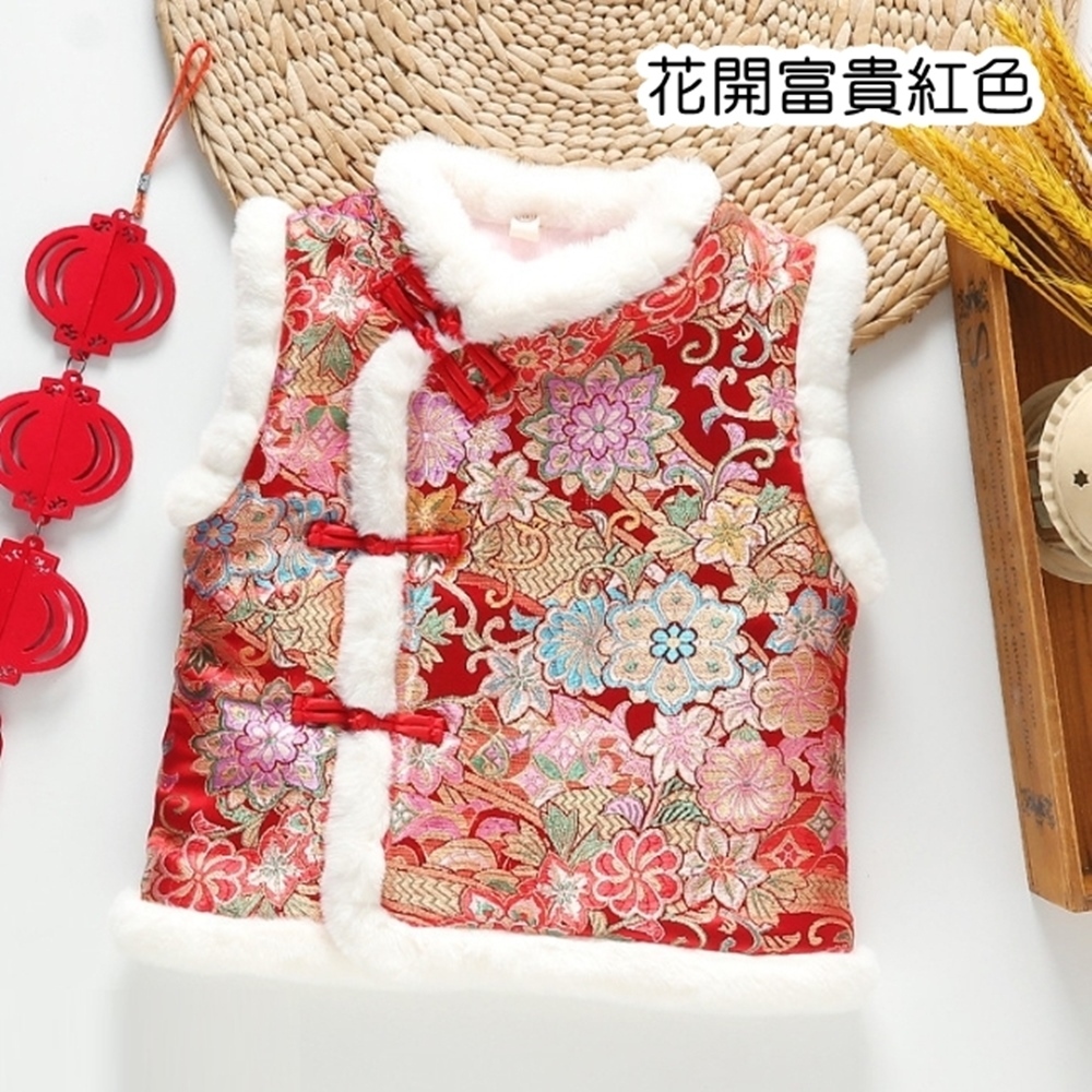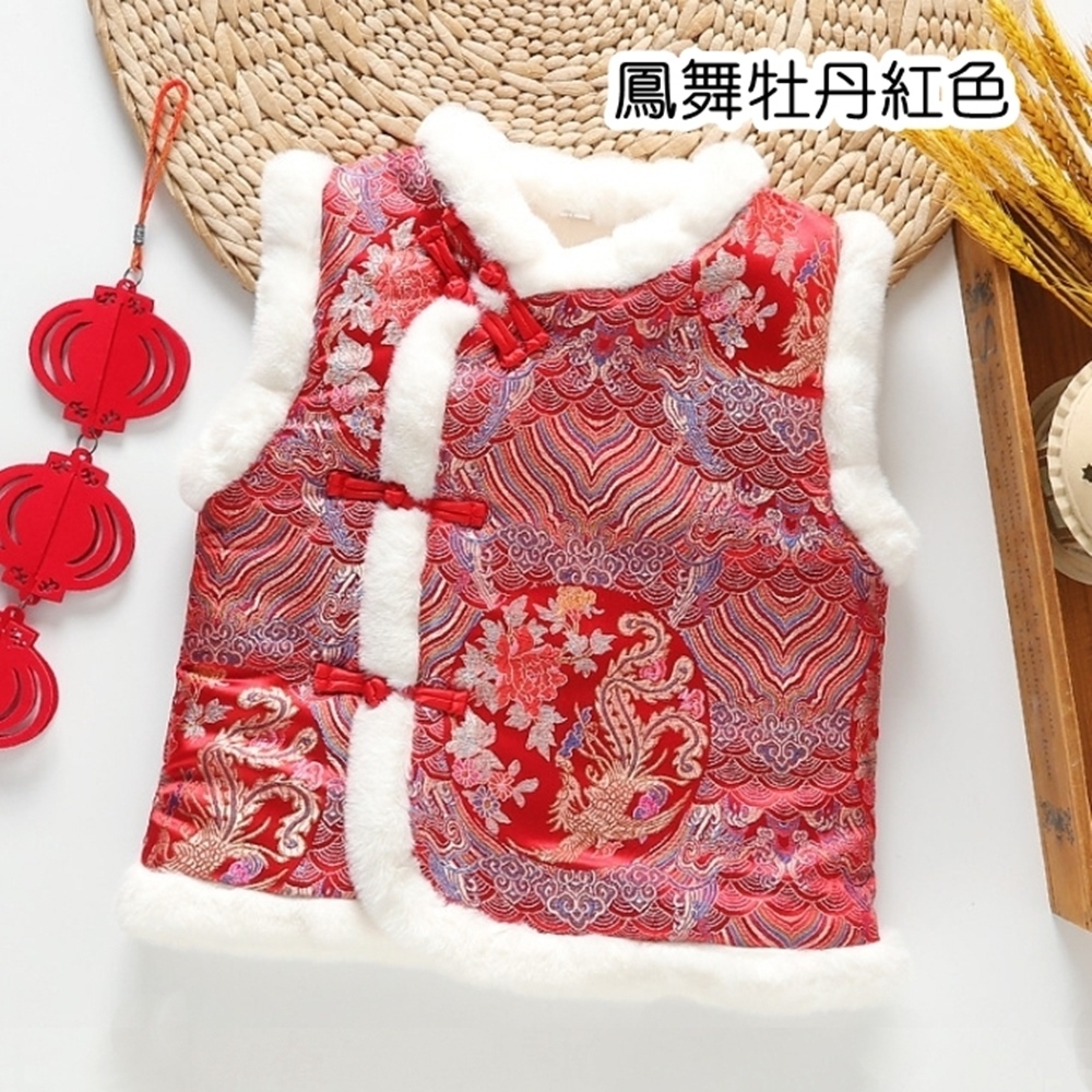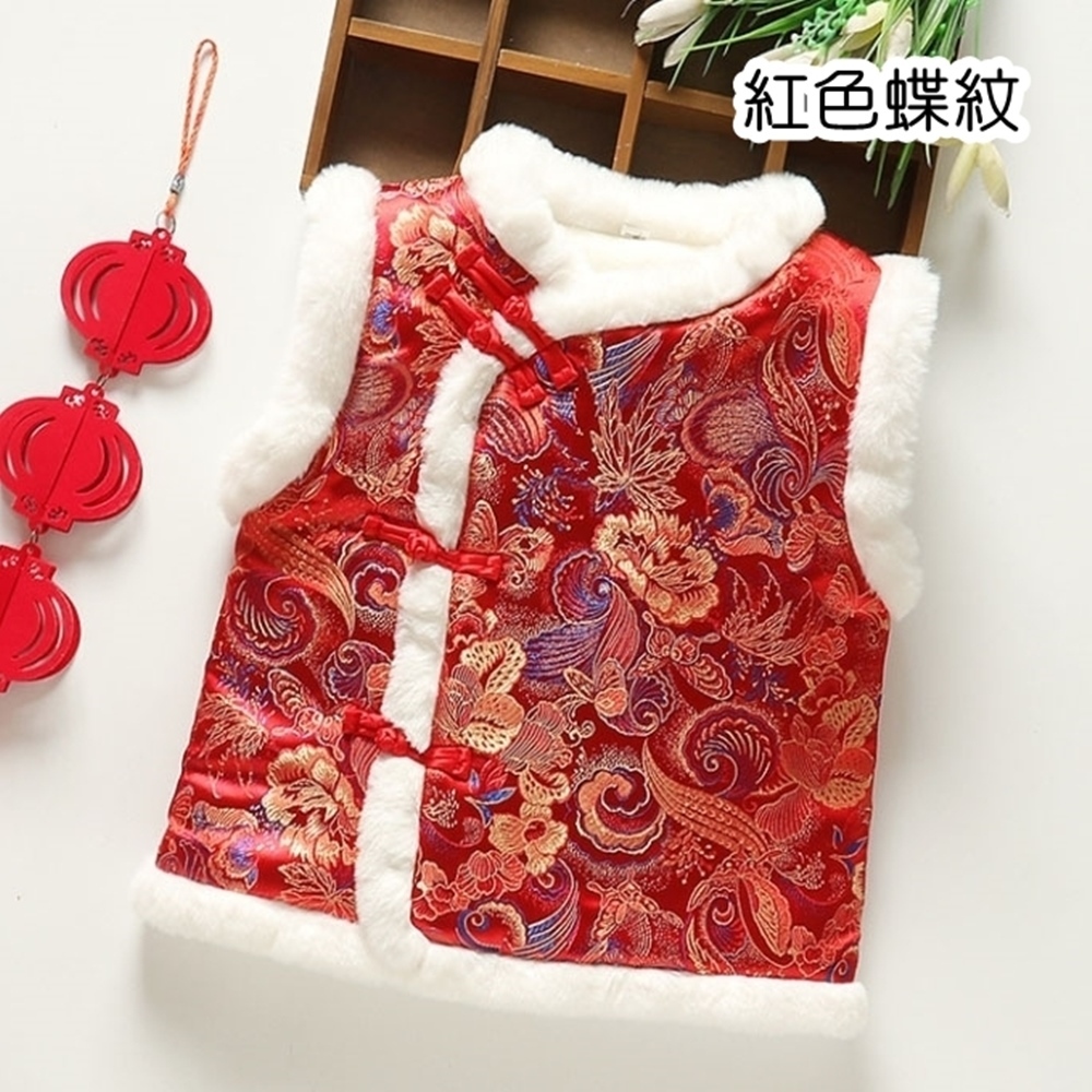 雲彩蝶紋牡丹毛毛領刺繡背心 大童 中國風 新年 過年 拜年 馬甲 唐裝 大紅 男童 女童 童裝 兒童【BB9328】