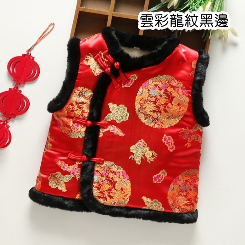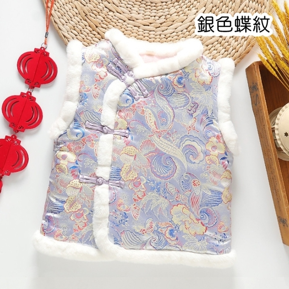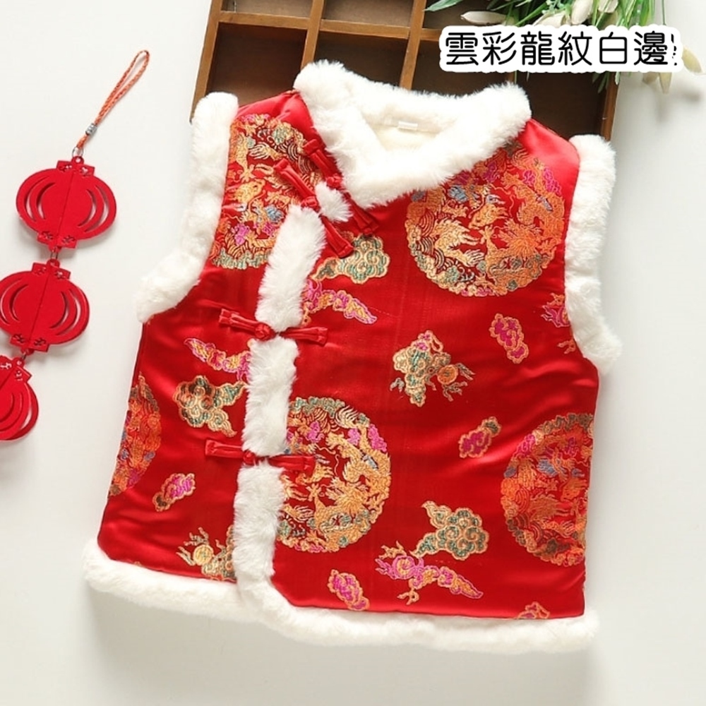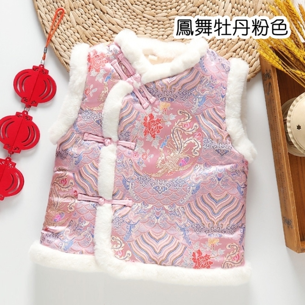 雲彩蝶紋牡丹毛毛領刺繡背心 大童 中國風 新年 過年 拜年 馬甲 唐裝 大紅 男童 女童 童裝 兒童【BB9328】