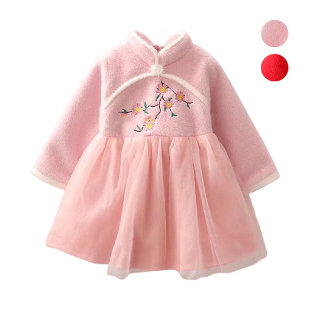 仿皮草毛絨內刷毛 旗袍拼接紗裙洋裝 旗袍裝 童裝 過年 唐裝 新衣 喜酒 女童【BB7253】