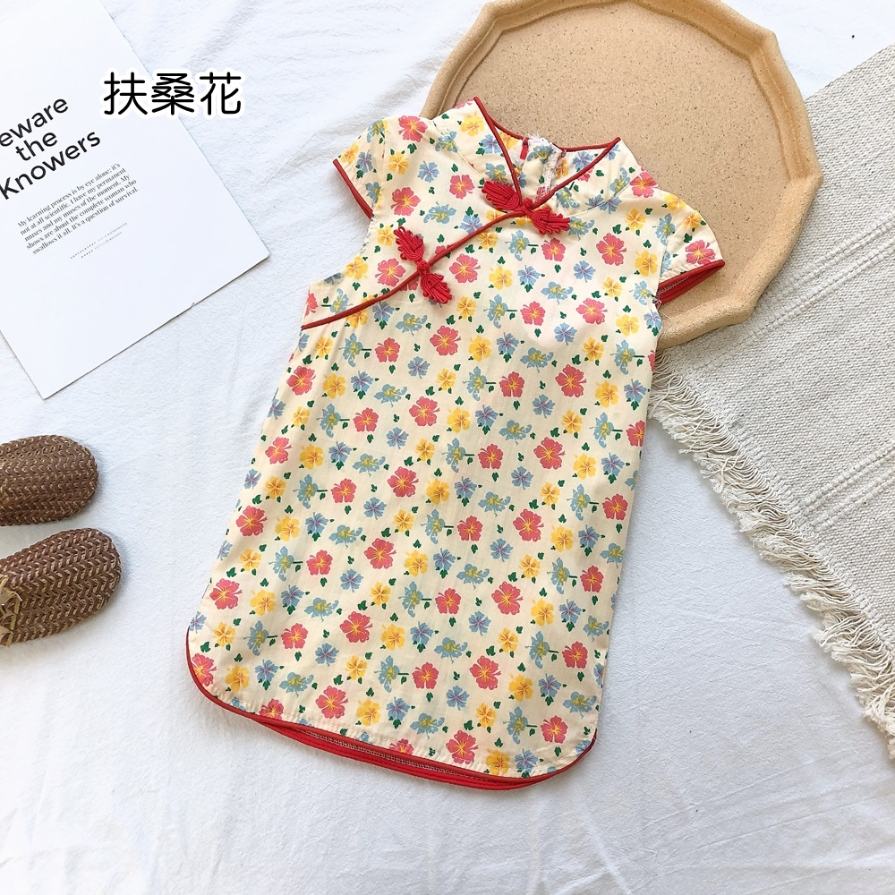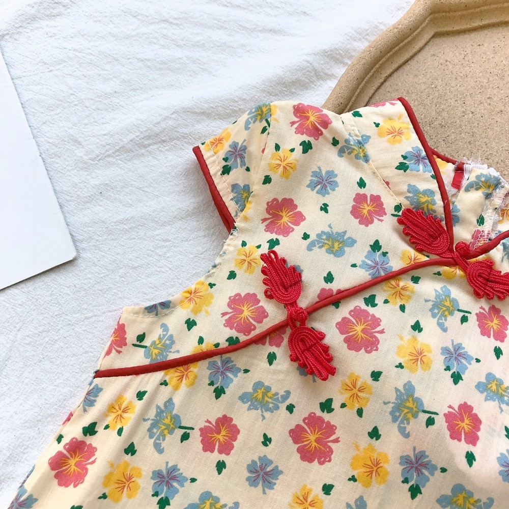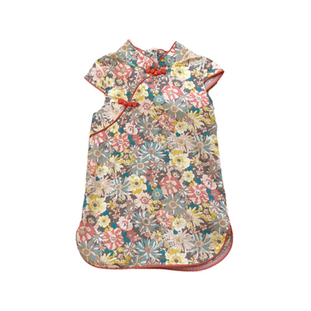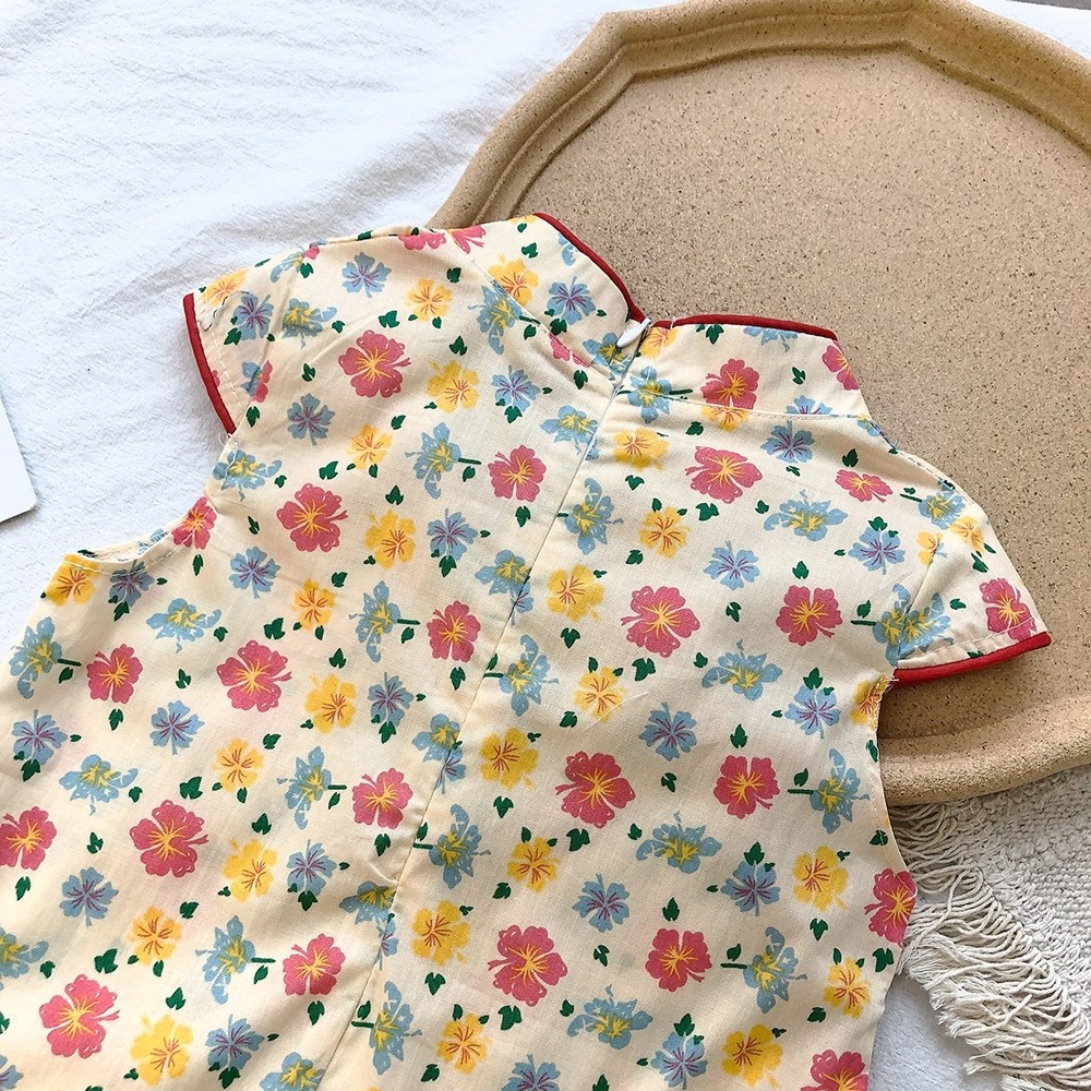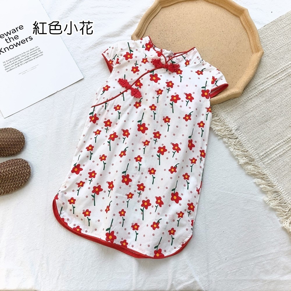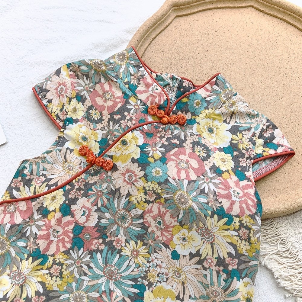 印花滾邊盤扣造型小包袖旗袍洋裝 洋裝 女童 連身裙 中童 中國風 現貨 兒童 童裝 【BB7742】