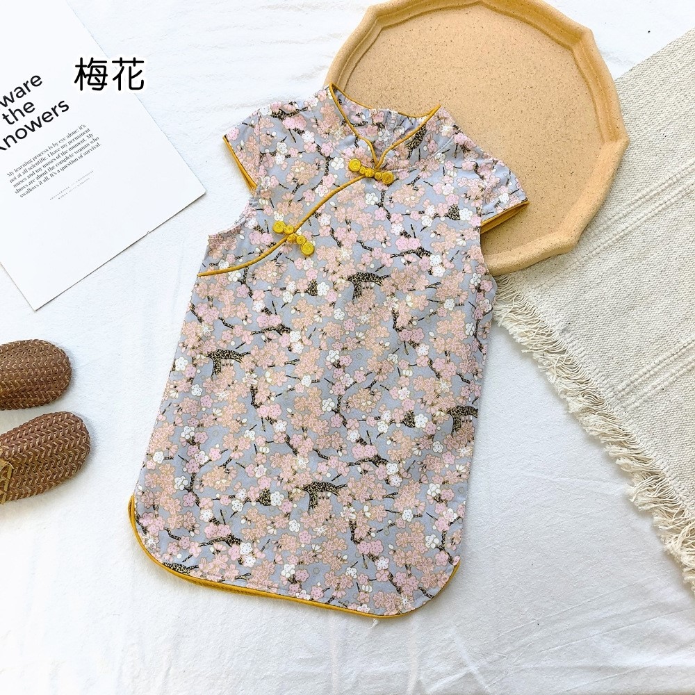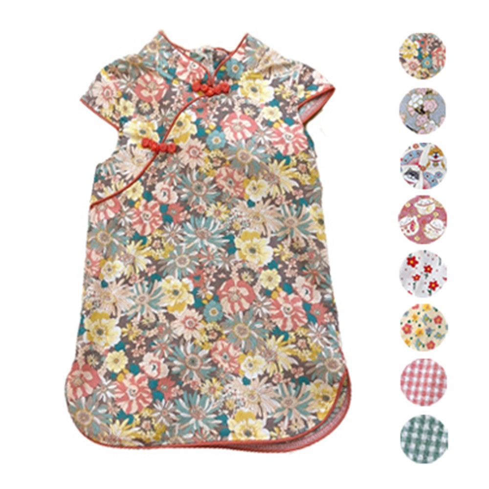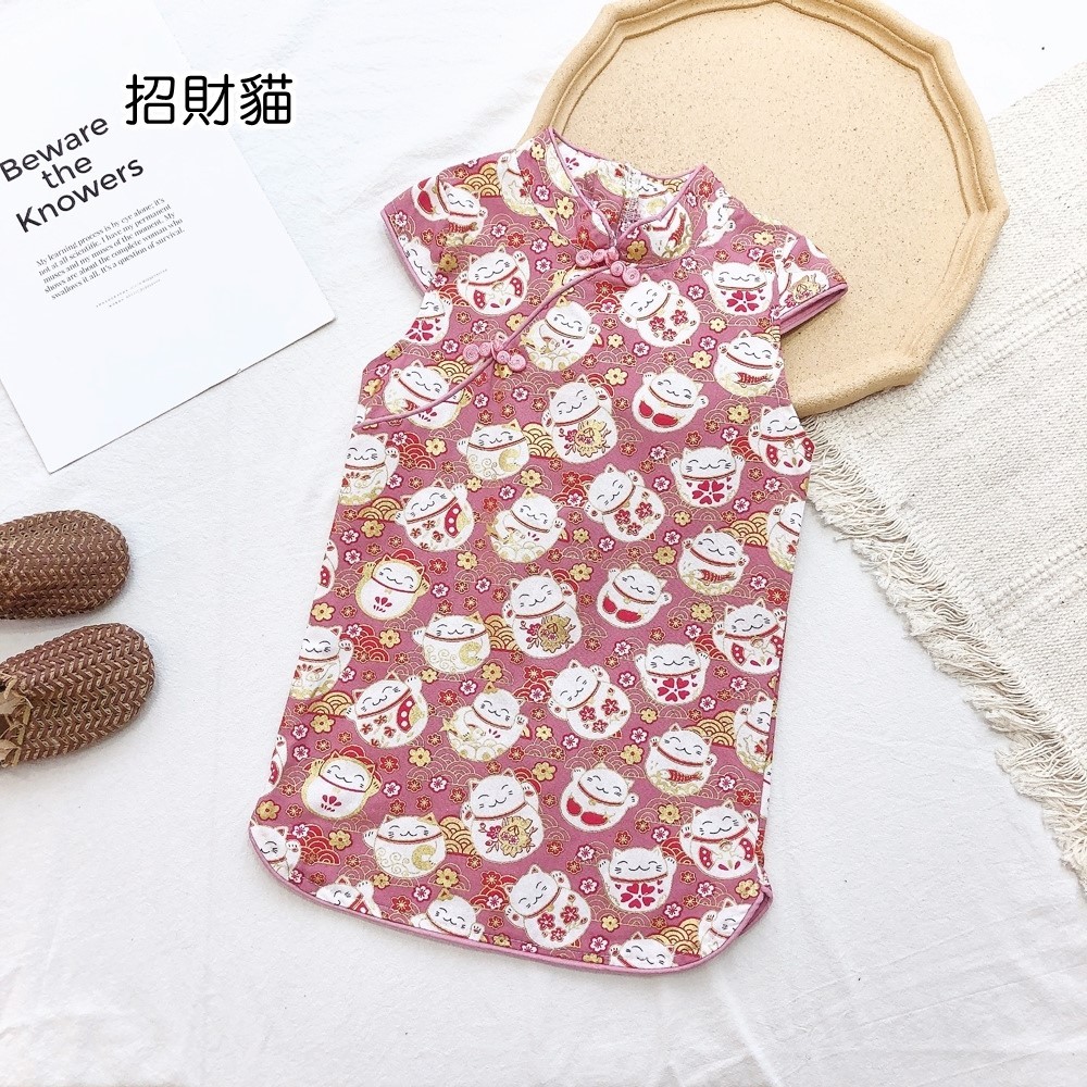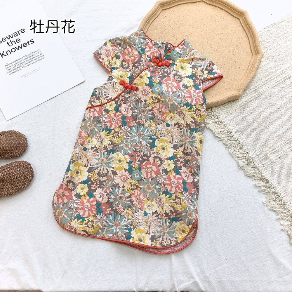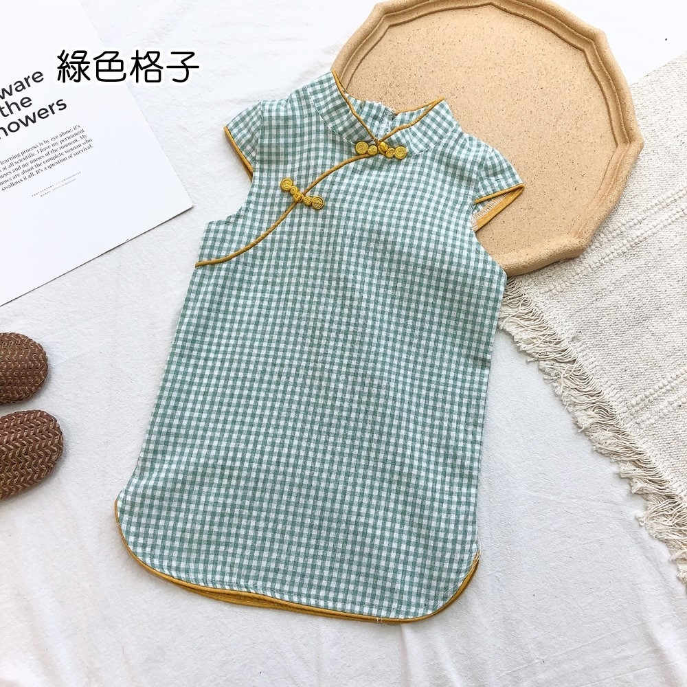印花滾邊盤扣造型小包袖旗袍洋裝 洋裝 女童 連身裙 中童 中國風 現貨 兒童 童裝 【BB7742】
