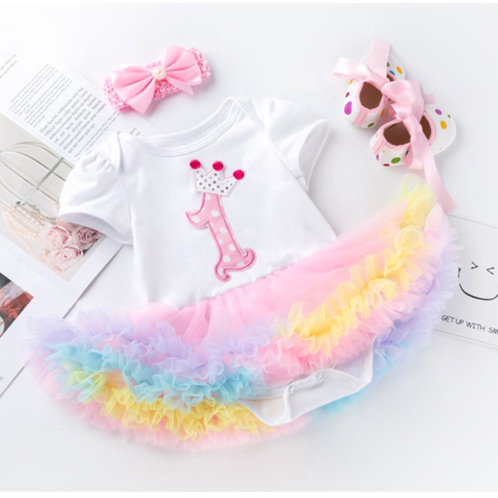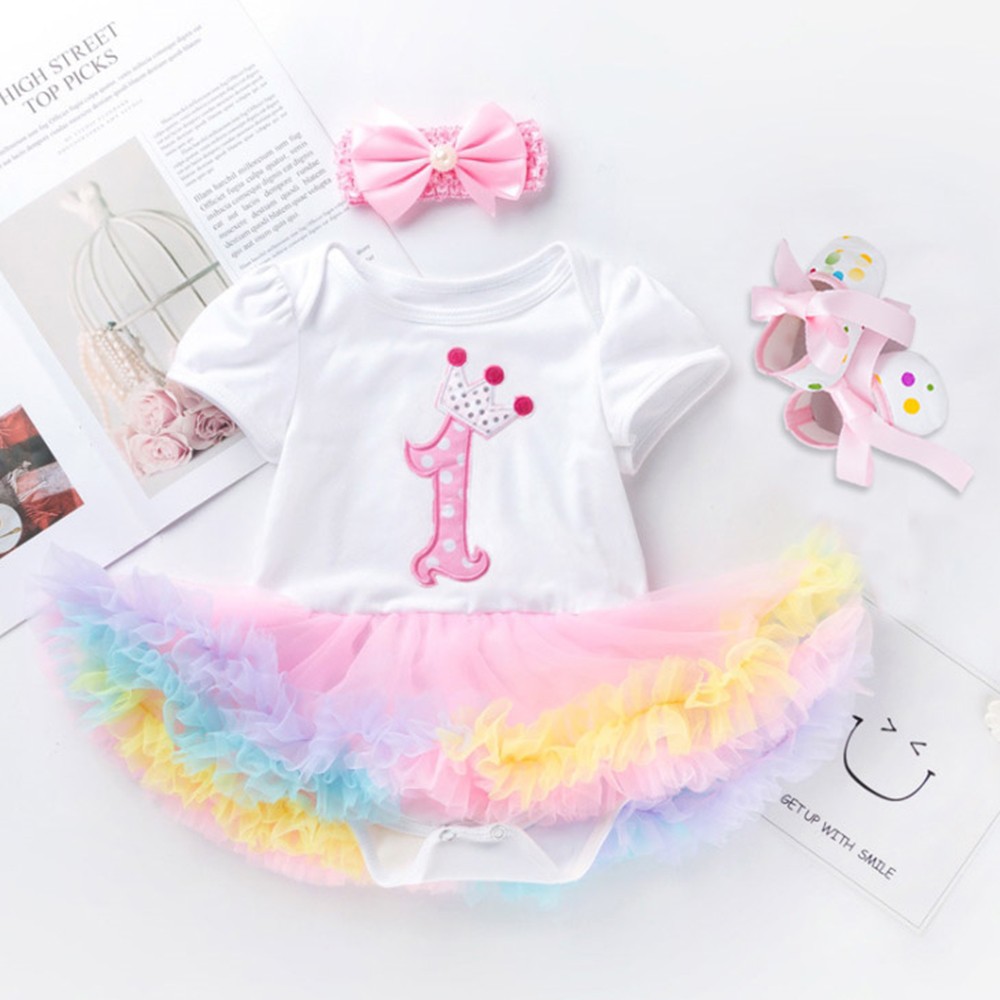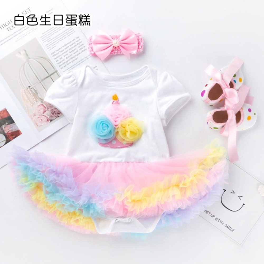 白色短袖拚接澎澎蕾絲紗裙包屁衣+髮帶+鞋子 三件套 生日 女童 周歲 造型服 抓週 【p0061225432185】