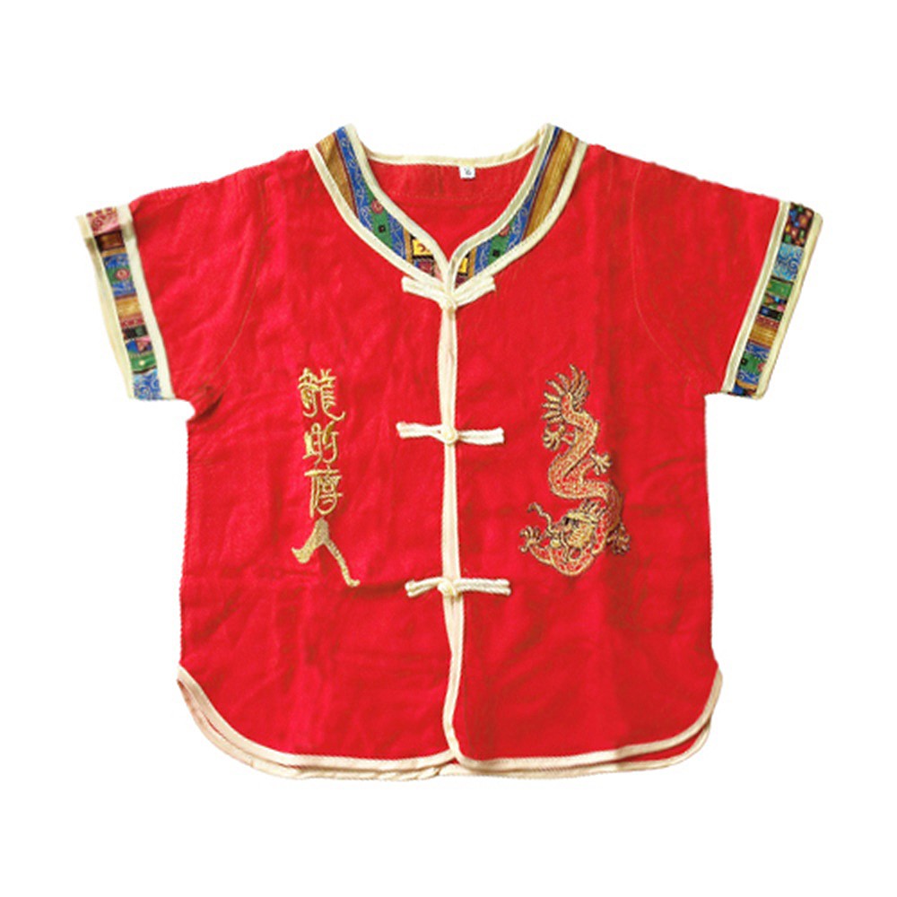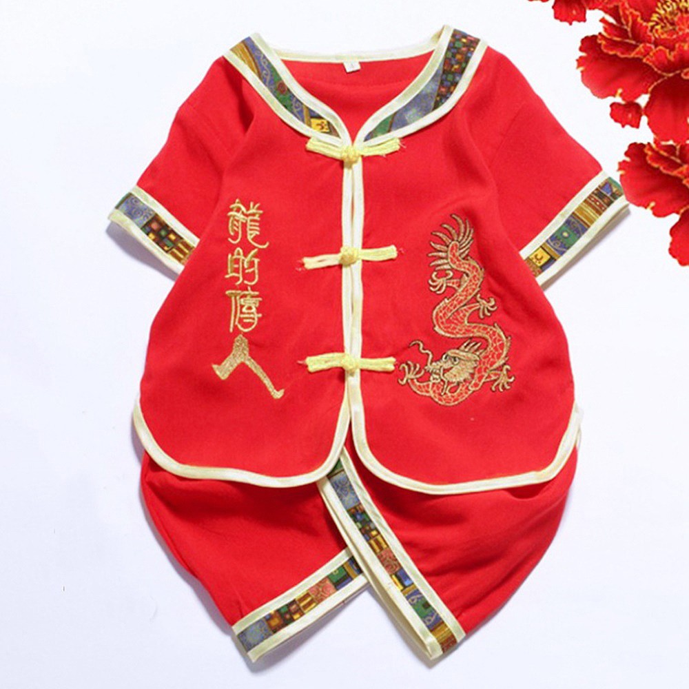 龍的傳人 刺繡圖騰滾邊薄款盤扣上衣+短褲 短袖套裝 唐裝 抓週 週歲 造型服 童裝 【BB8916】