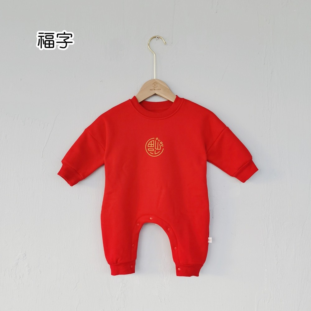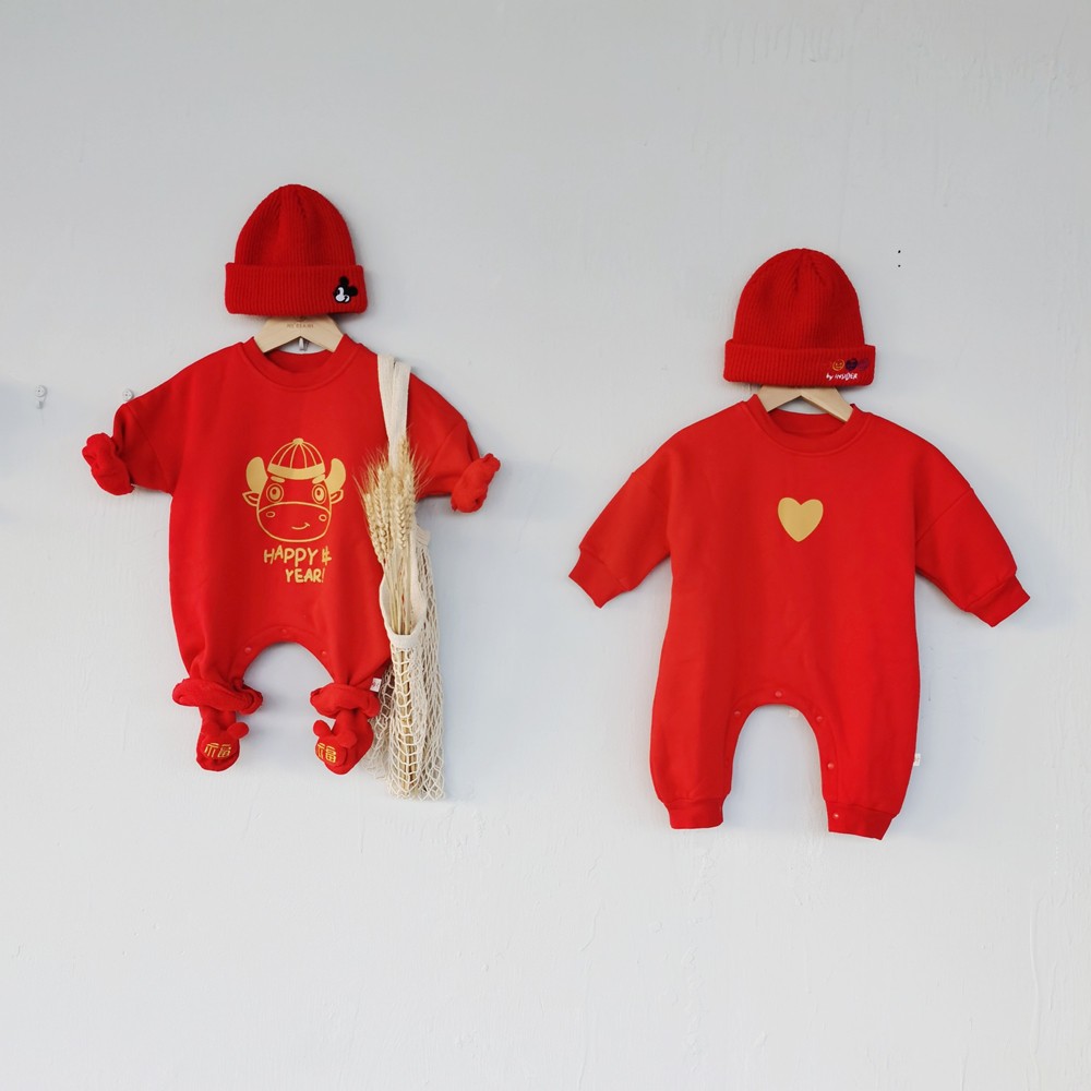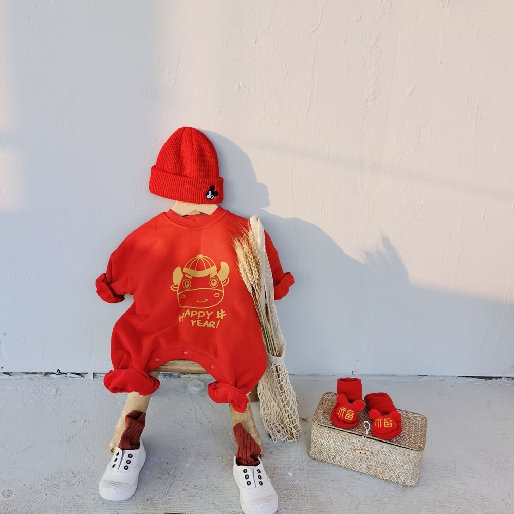 牛塗鴉寬鬆肩扣連身包屁衣 不含毛帽 牛年 新生兒 寶寶 童裝 拜年服 過年 大紅 新年【p0061221839509】