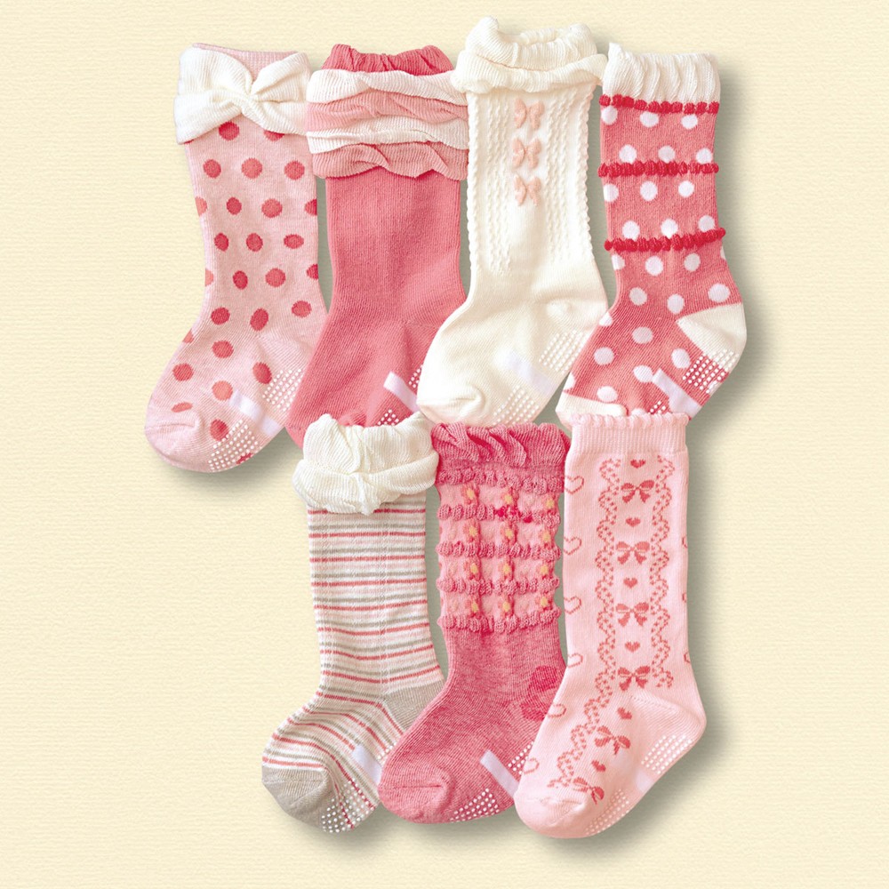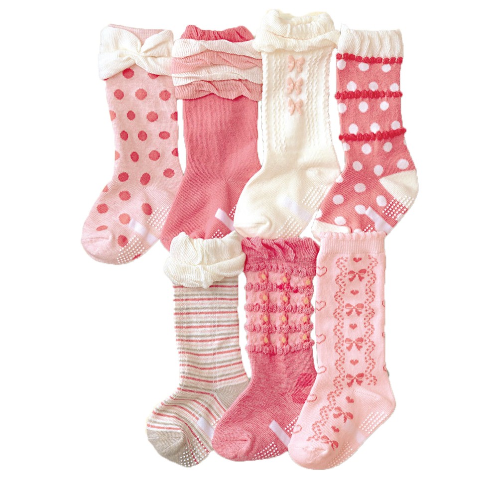 (7雙一組) 粉色點點公主風高筒襪 防滑膠點 中筒襪 長筒襪 襪子 女童 兒童 橘魔法 【BB7778】