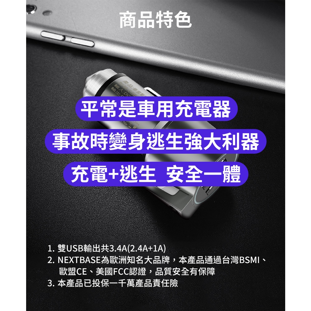 NEXTBASE 三合一車充【 雙USB 3.4A 車窗擊破器 安全帶割刀 】車用充電器