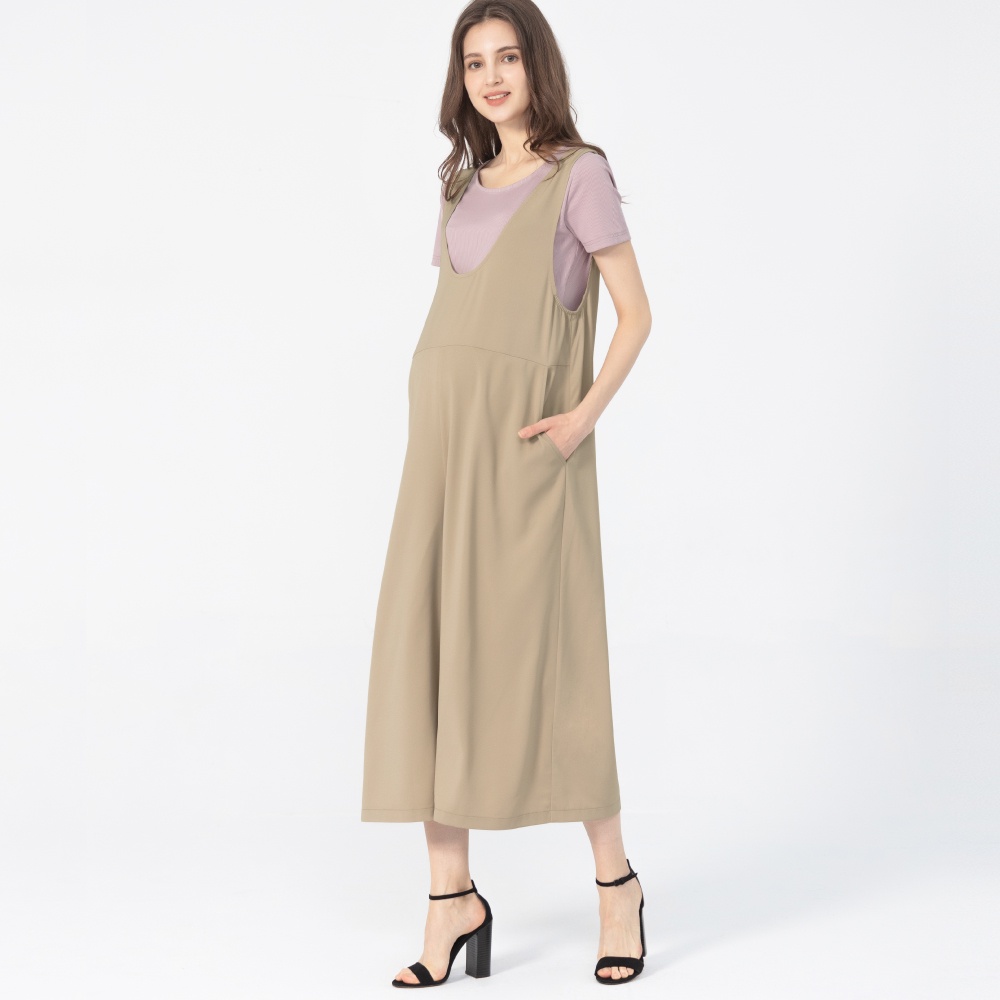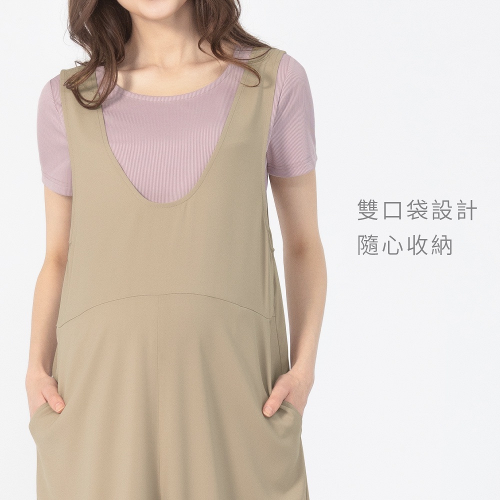 【Gennies 奇妮】大U領吊帶連身孕婦寬褲-卡其(TJN04)