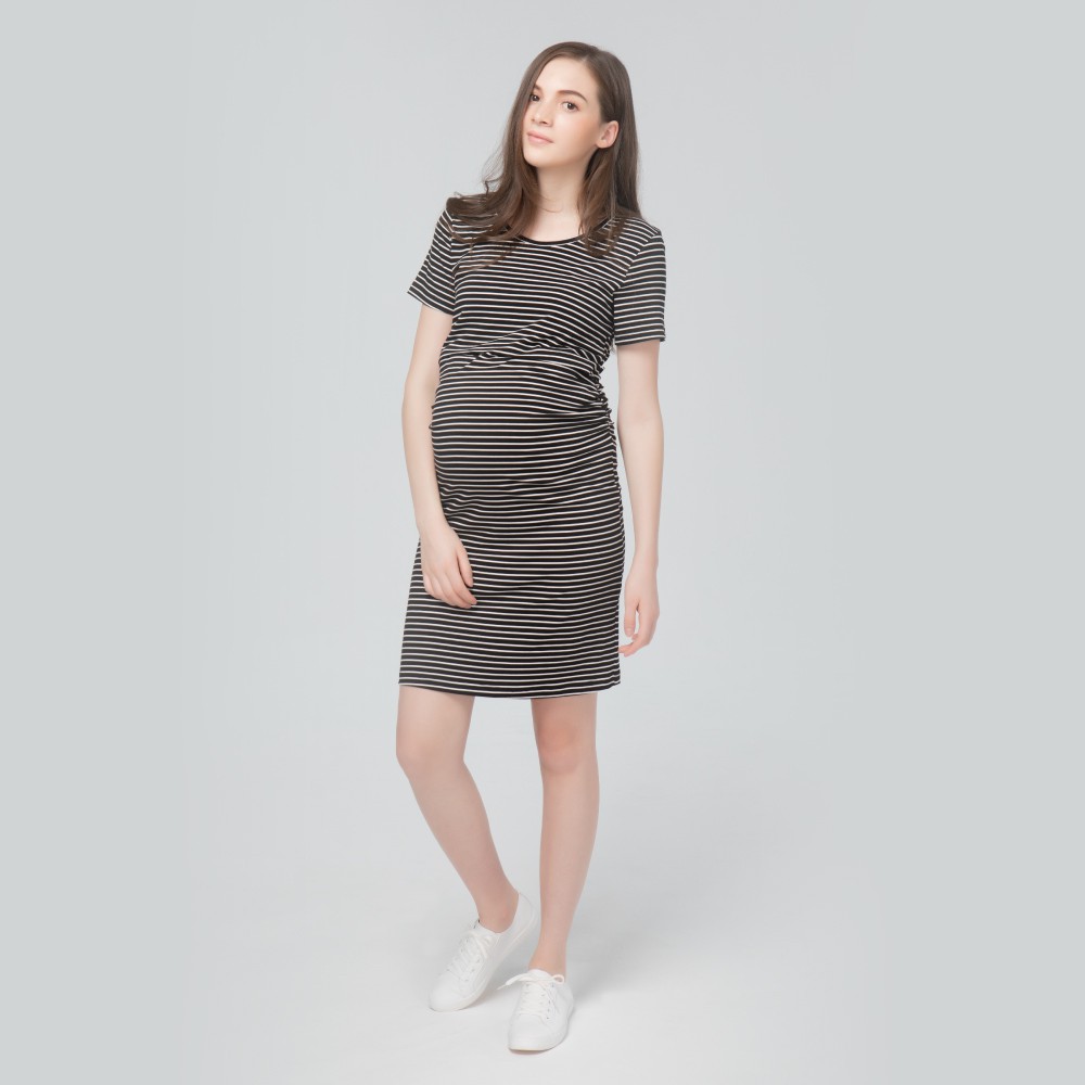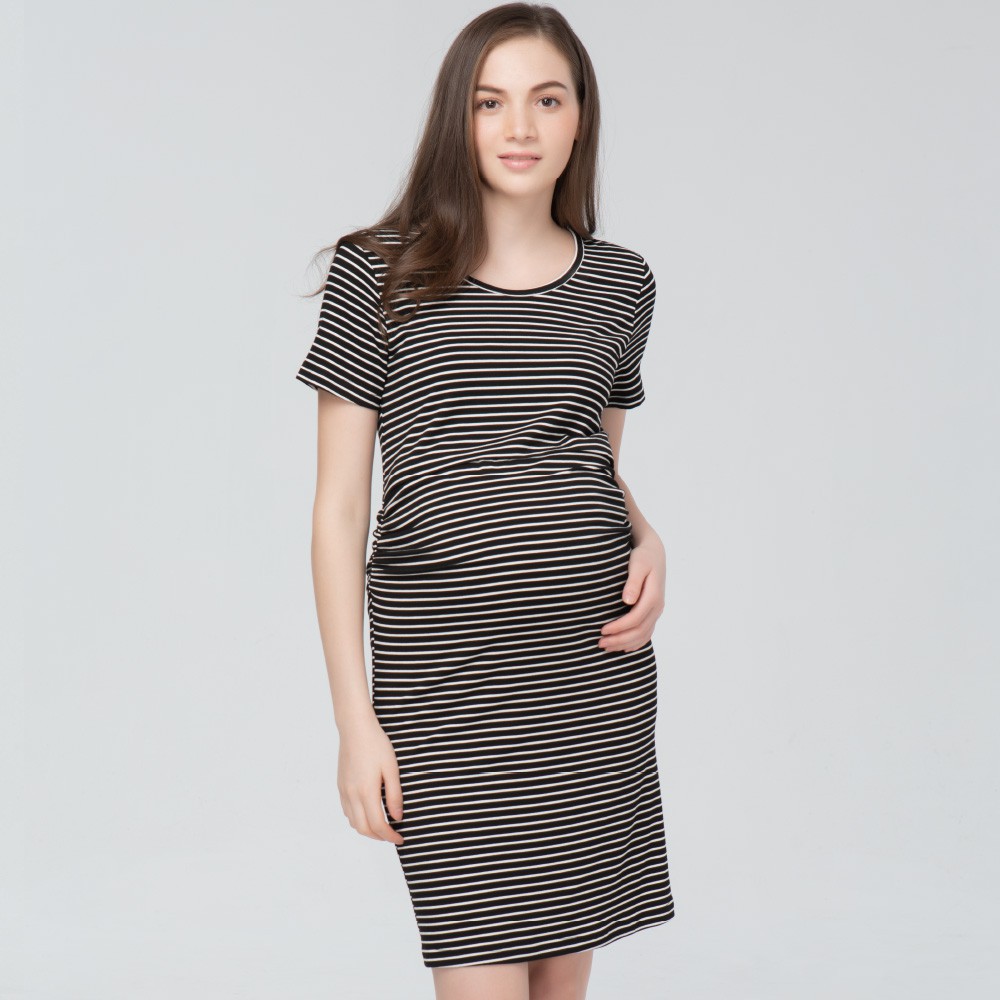 【Gennies 奇妮】一件式修身哺乳洋裝-黑白條紋(T1J06)