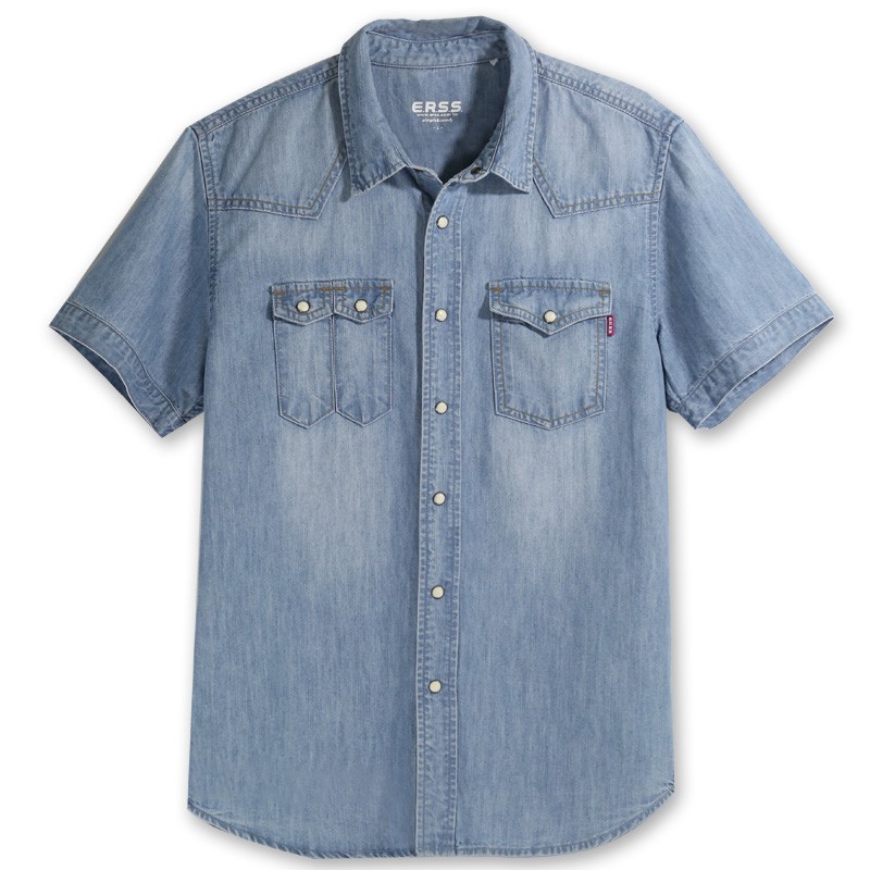 【ERSS】 男裝 襯衫 短袖 牛仔 牛仔襯衫 短袖襯衫 雙口袋 白釦 水洗 刷白 深藍【K40004】
