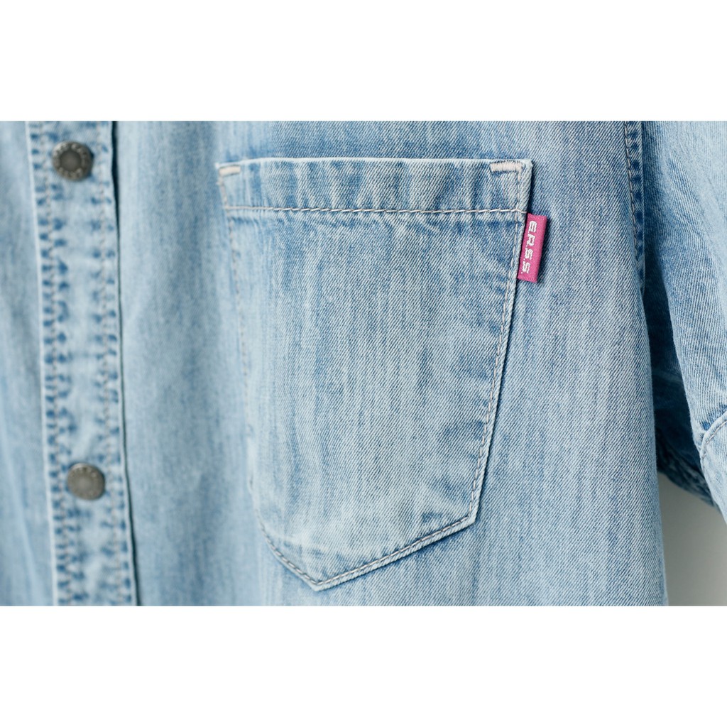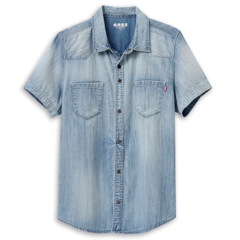【ERSS】男裝 襯衫 牛仔 牛仔襯衫 休閒襯衫 短袖襯衫 短袖上衣 雙口袋 水洗 刷白 漂淺藍【K40005】