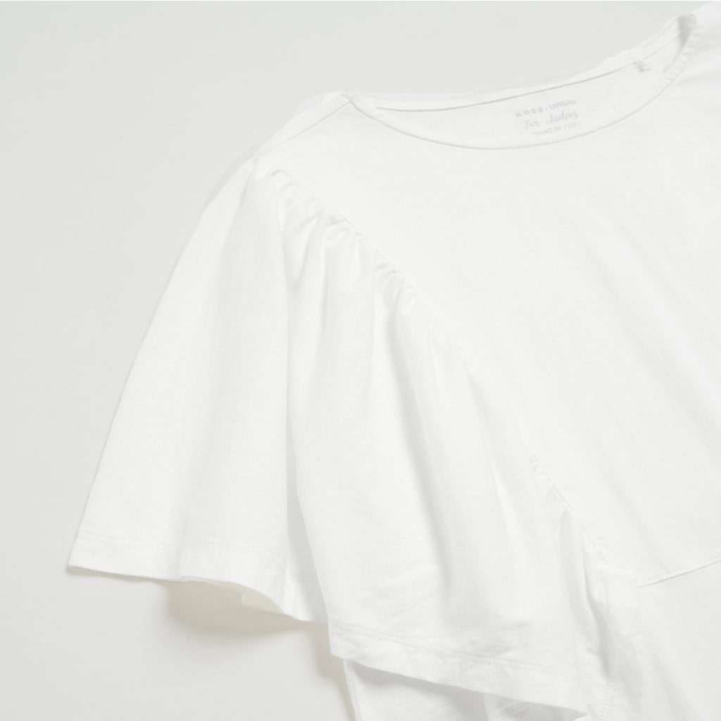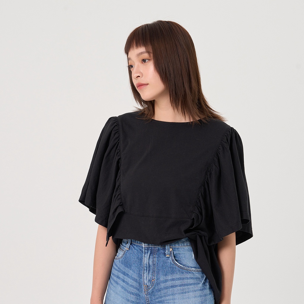 【ERSS】女裝 短袖 女生 t恤 短袖上衣 寬版上衣 慵懶風 飄飄 荷葉袖 黑色【K70295】