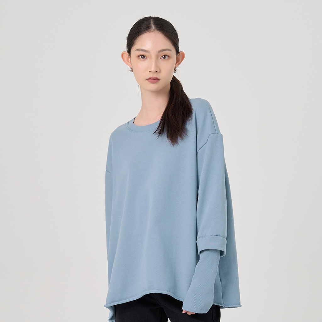 【ERSS】女裝 長袖上衣 長袖 上衣 七分袖 假兩件 袖寬 慵懶上衣 灰藍【K60248】