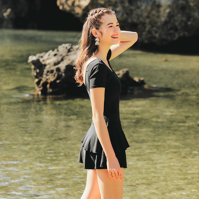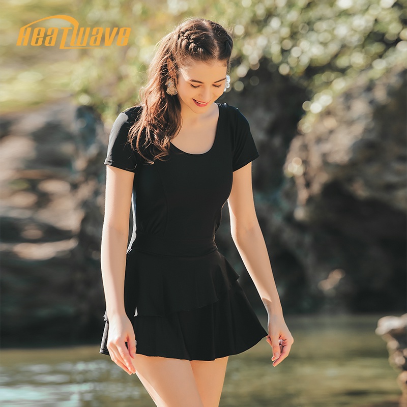 Heatwave熱浪保守連身裙式游泳衣女遮肚性感黑色顯瘦聚攏短袖大碼泳裙