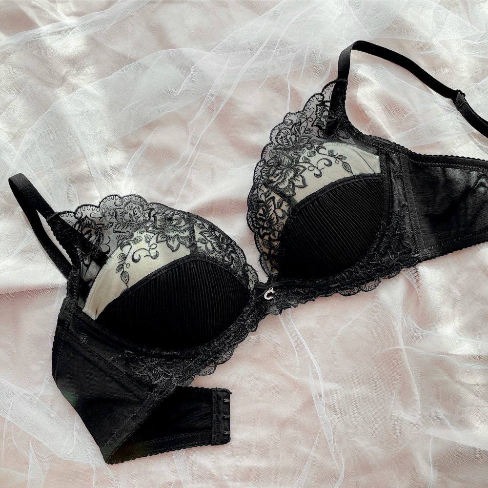 【Mini Queen】獨家 閨蜜莉娜 單內衣 爆乳優雅刺繡蕾絲澎澎杯軟鋼圈內衣 (黑色65B-95F)