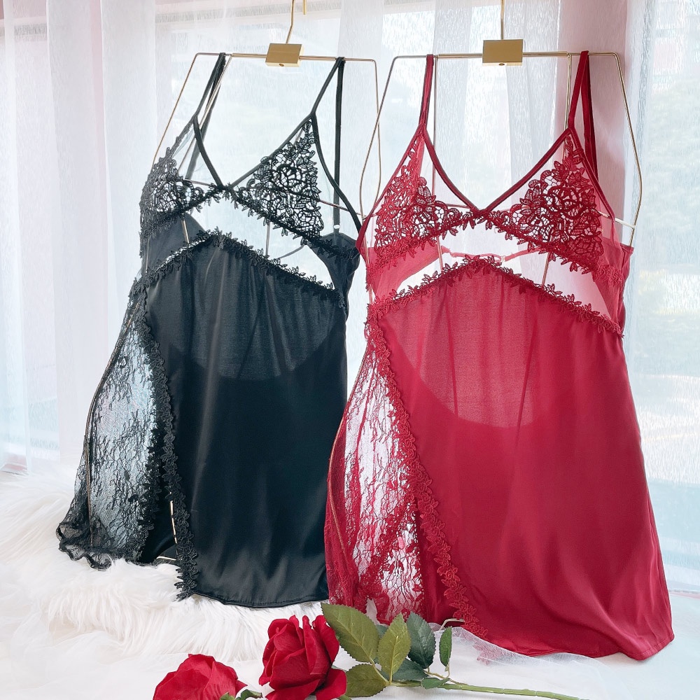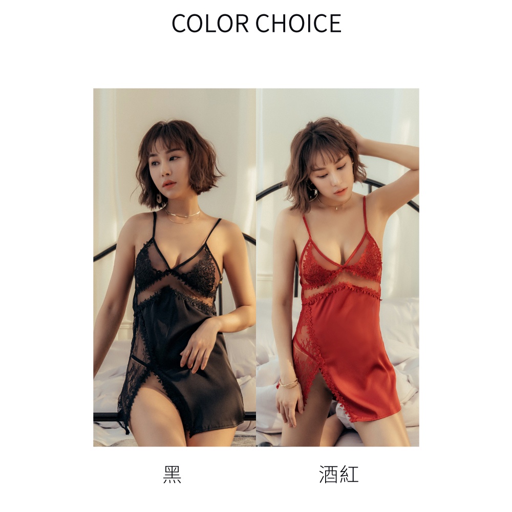 Mini Queen 睡衣(黑色)性感水晶性感緞面鏤空蕾絲側面透膚開岔睡衣組