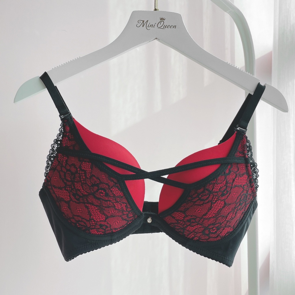 【Mini Queen】獨家 爆爆BABY 單內衣 性感交叉細帶L型鋼圈低脊心集中托高內衣(酒紅65A-95H)