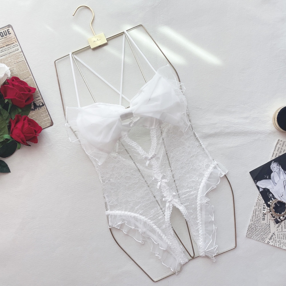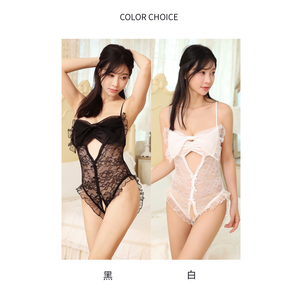 【Mini Queen】微醺露露 連身衣 性感蝴蝶結鏤空蕾絲開襠連身衣情趣睡衣 (黑色)