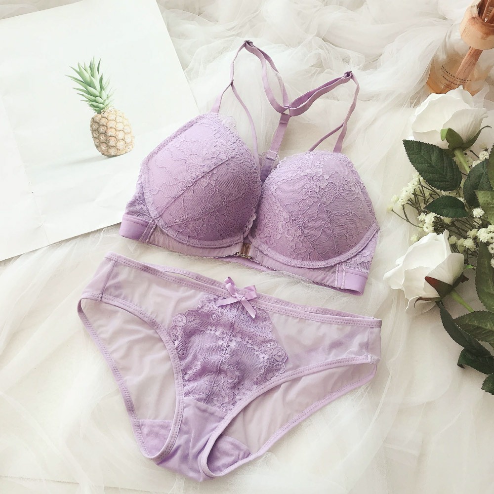 【Mini Queen】獨家 魔幻VIVI 性感深溝前扣式細帶蕾絲美背成套內衣 (薰衣草紫65-90 A-G)