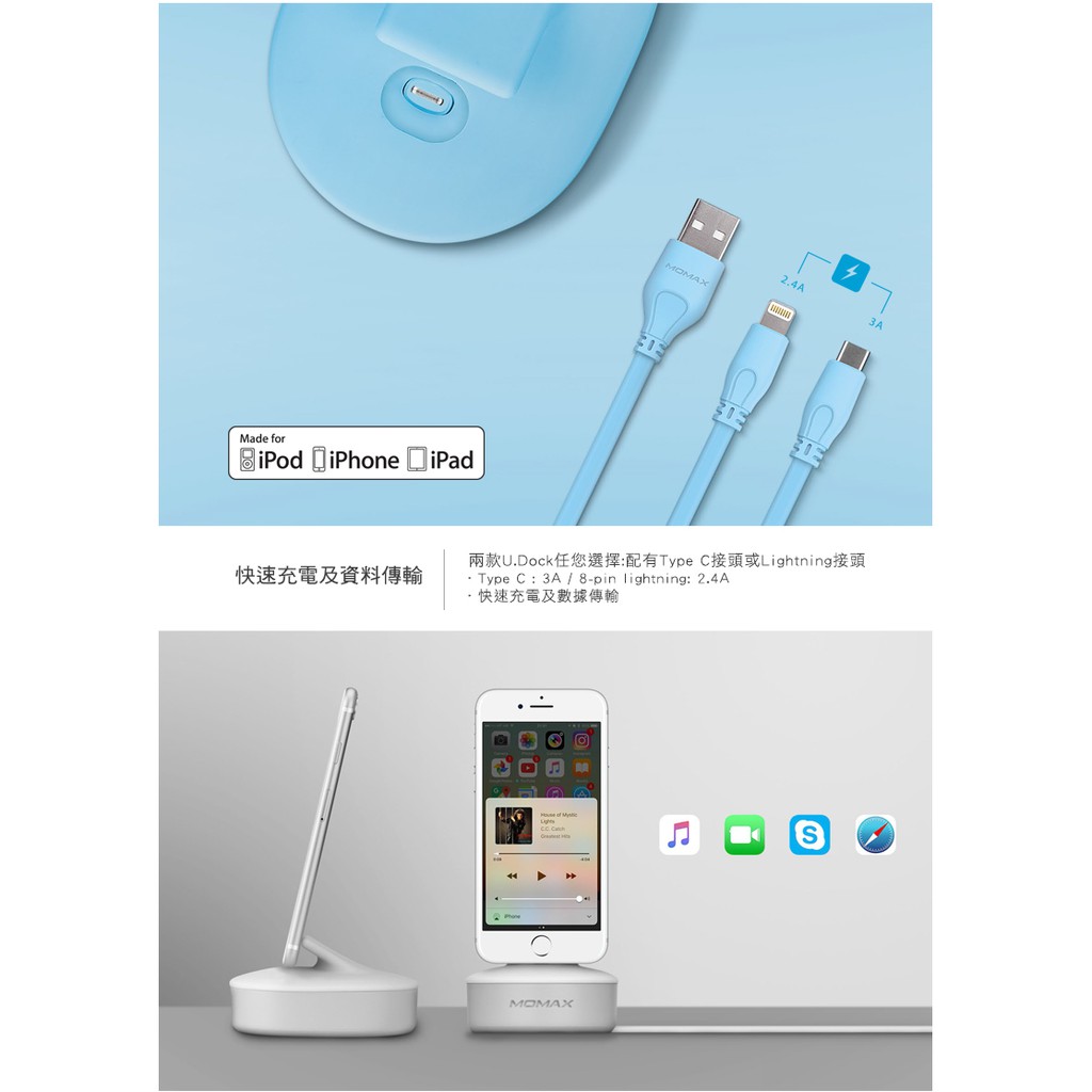 【MOMAX原廠】 U.Dock MFI認證/2.4A 蘋果接頭/快速充電座