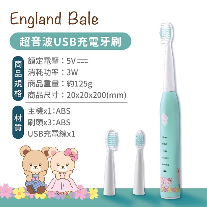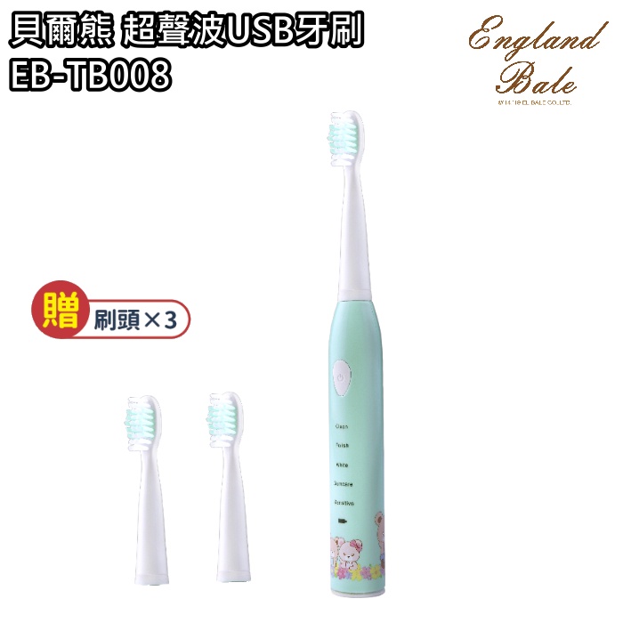 【英國貝爾熊】超聲波USB充電牙刷 電動牙刷 贈3枚刷頭 EB-TB008