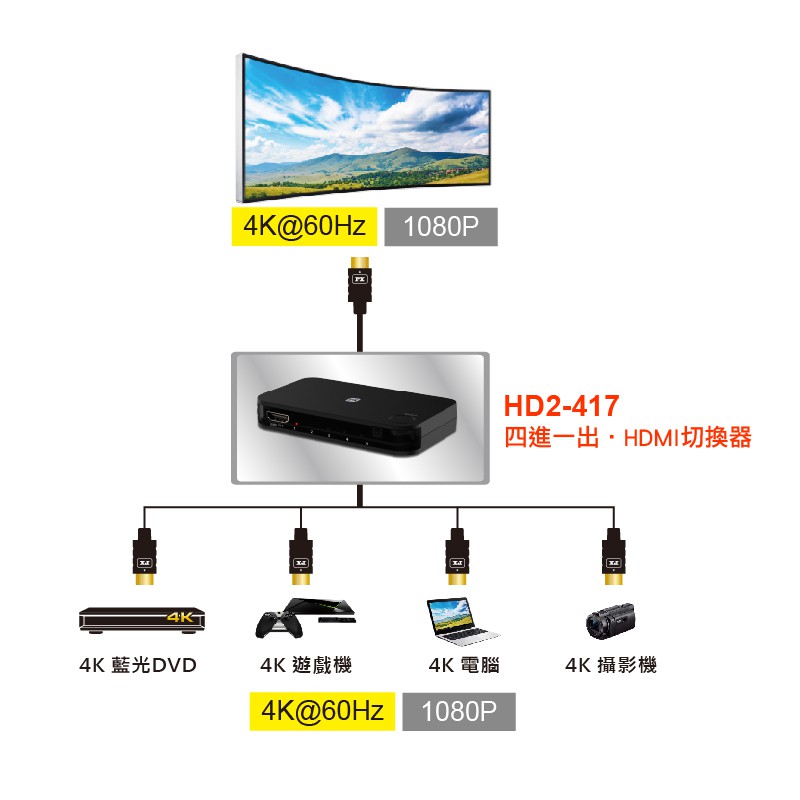 大通 HDMI切換器 HD2-417 hdmi高畫質4進1出切換分配器4K 筆電用四進一出