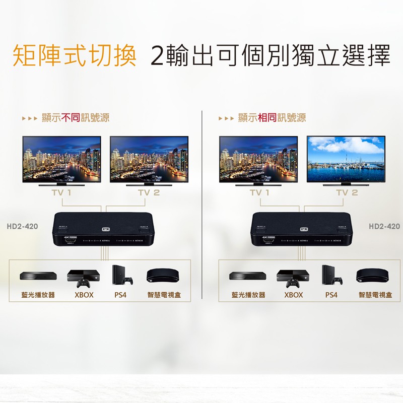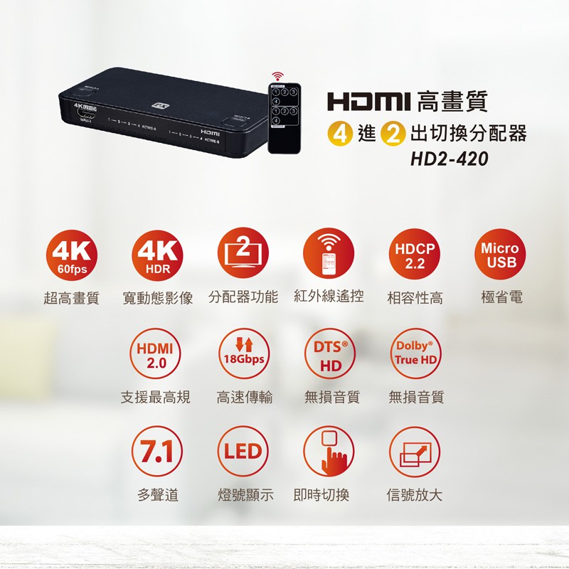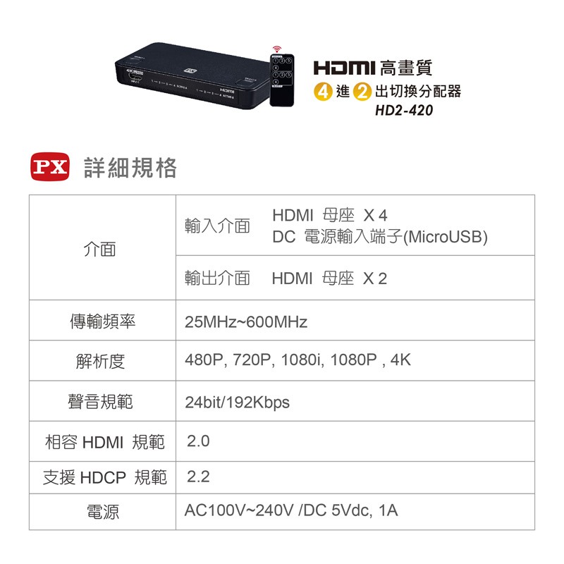 PX 大通 HD2-420ARC HDMI 4進2出切換器分配器 真4K 電視 電腦 矩陣 HD2-420ARC