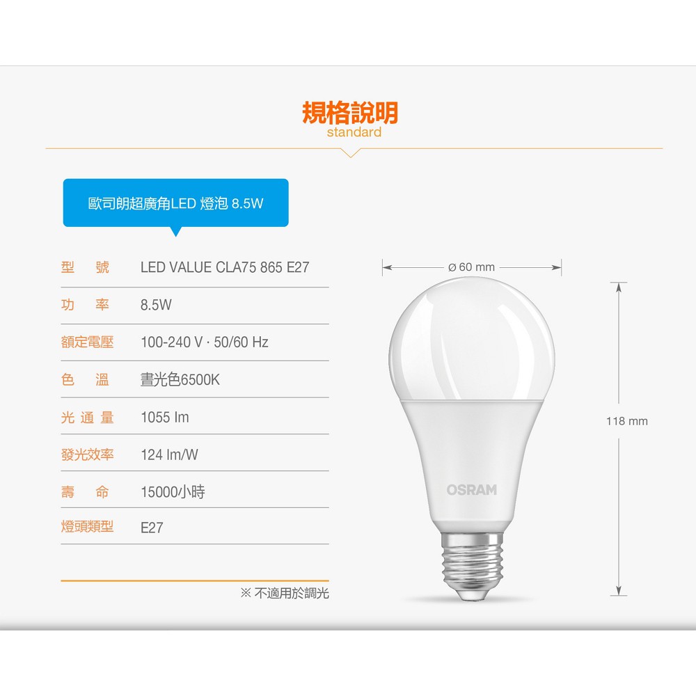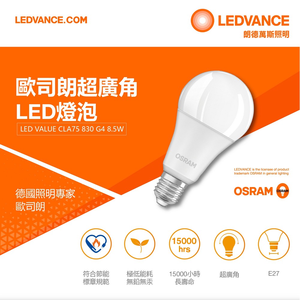 歐司朗8.5W LED超廣角LED燈泡-節能版 6入