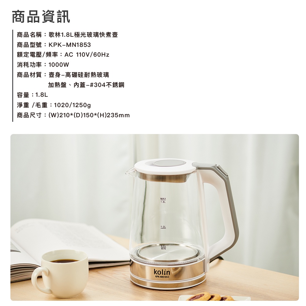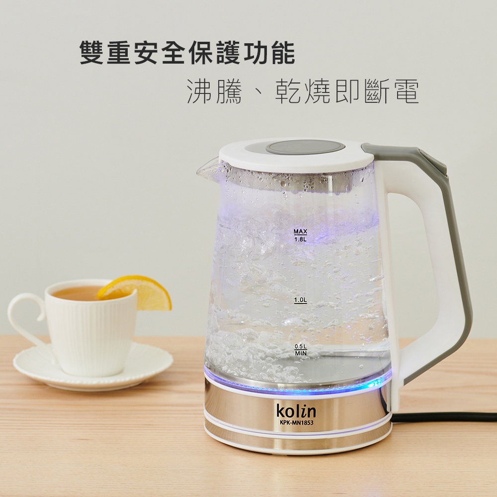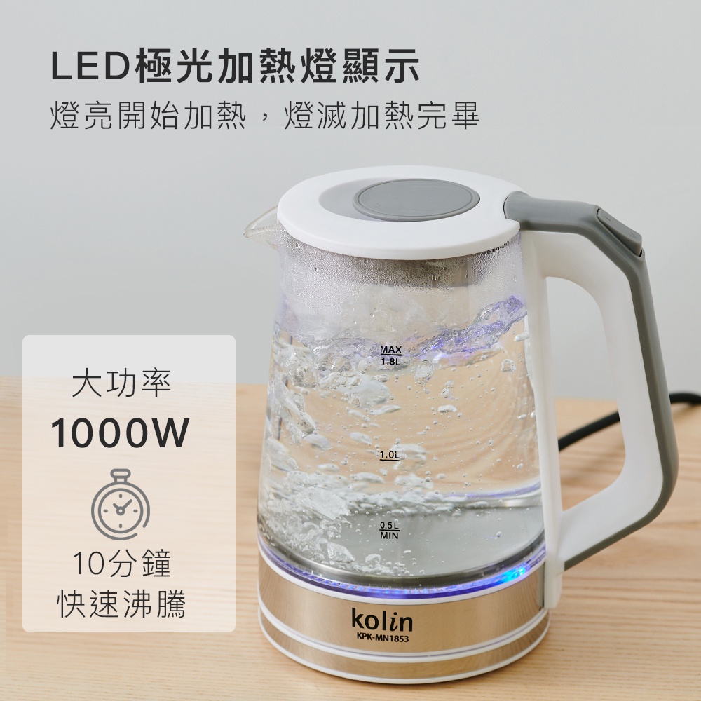 [福利品]【Kolin】歌林1.8L極光玻璃快煮壺KPK-MN1853 熱水壺 沖泡壺 泡茶壺機 沸騰自動斷電