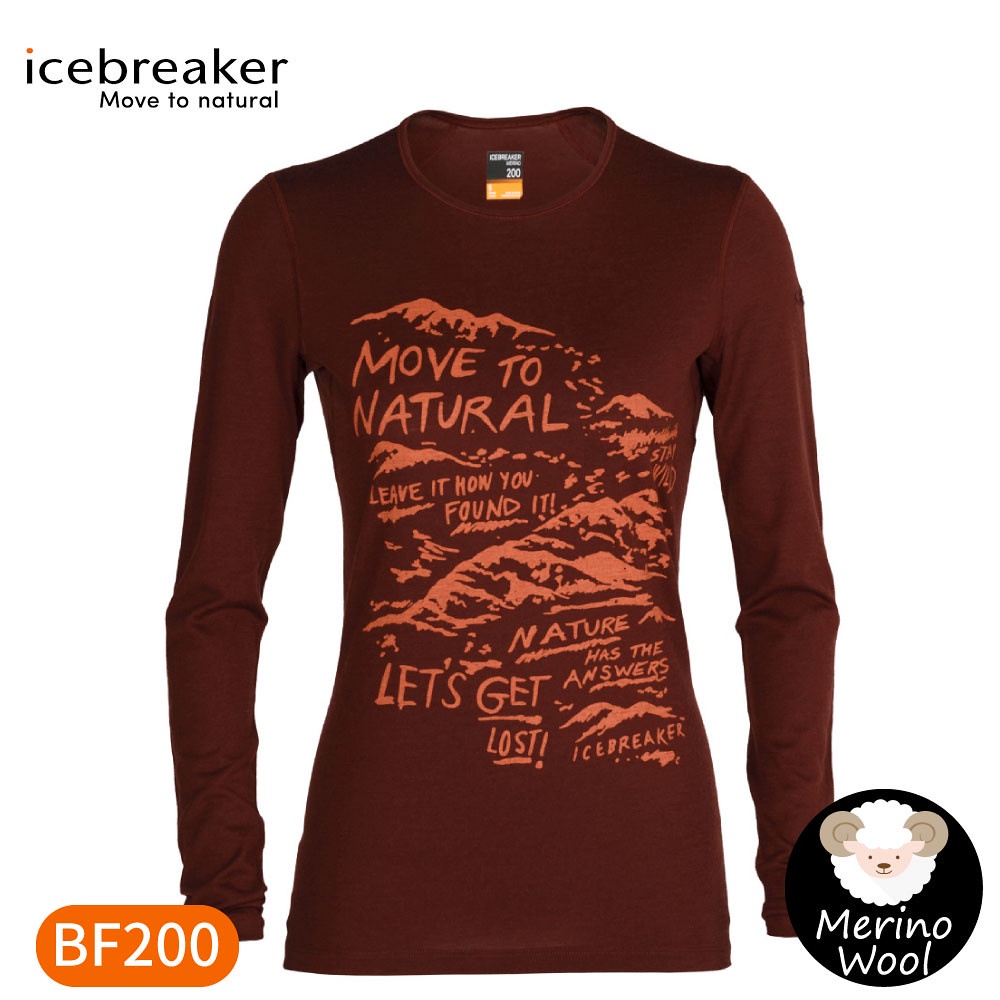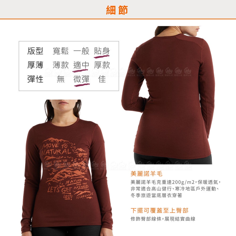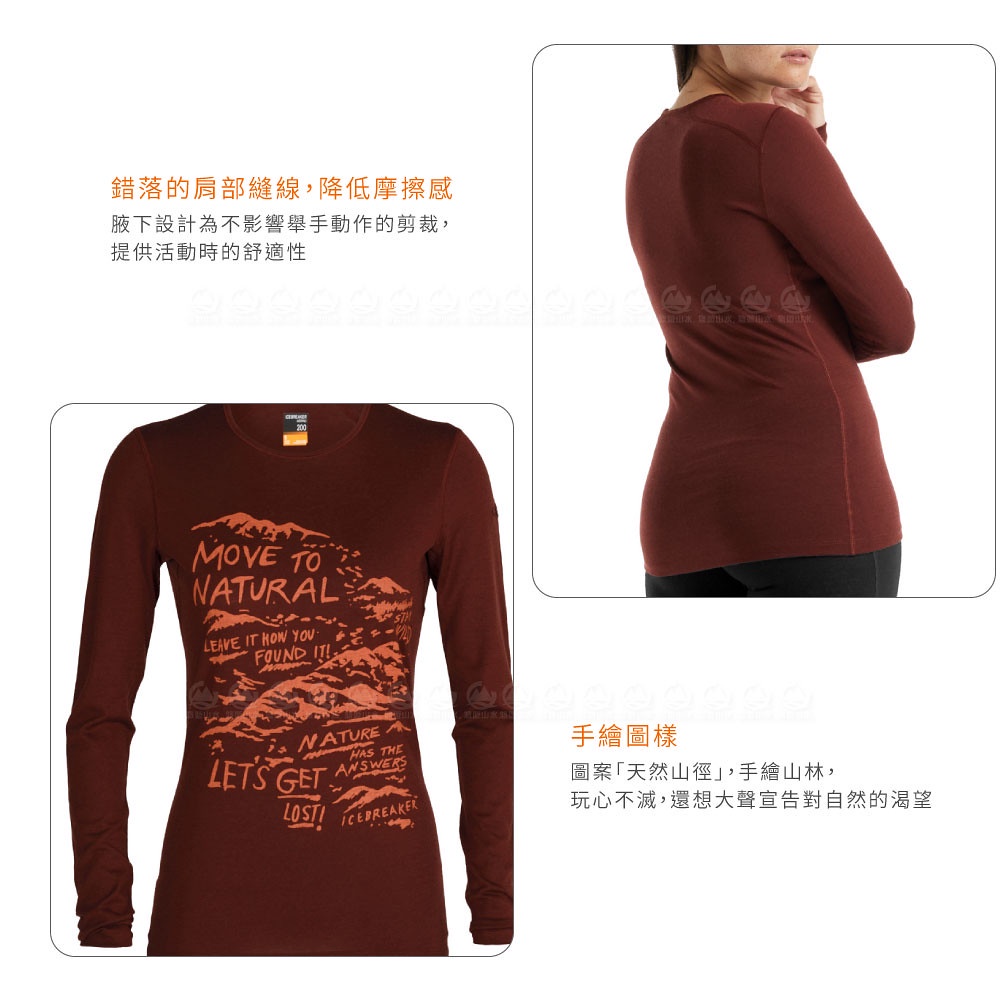 【Icebreaker 女 Oasis 圓領長袖上衣BF200《天然山徑/酒紅》】0A59KU/內層衣/薄長袖/內著