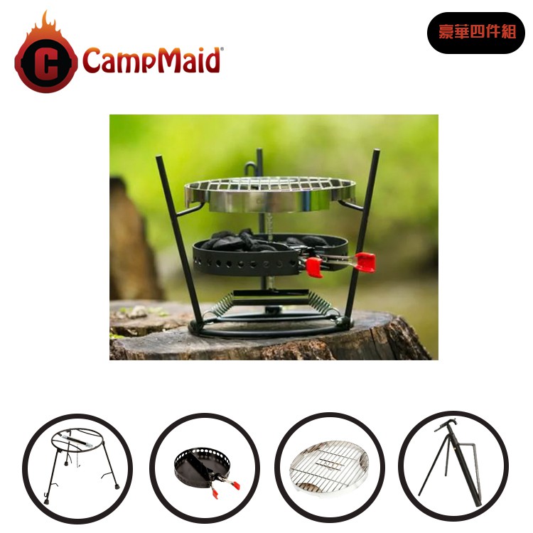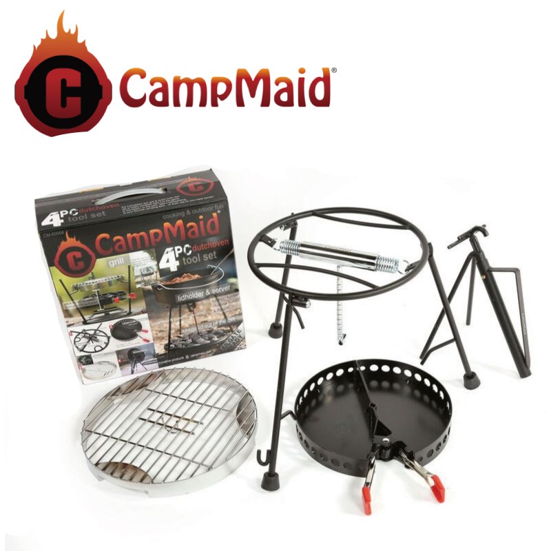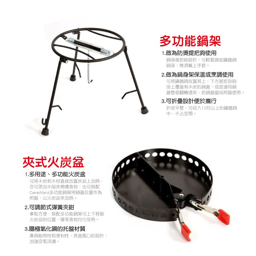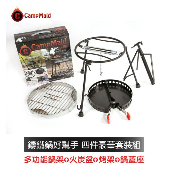【Camp Maid 美國鑄鐵鍋好幫手四件豪華套裝】60006/鍋架+夾式炭盆+烤架+鍋蓋座/荷蘭鍋用具/悠遊山水