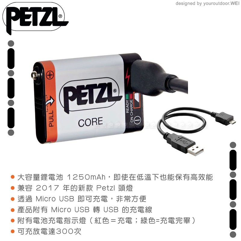 【PETZL 法國 ACCU Core 充電式鋰電池】E99ACA/1250mAh大容量/USB連接線充電/悠遊山水