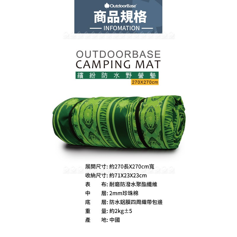 【OutdoorBase 繽紛綠防水野營墊270x270cm】21942/地墊/睡墊/野餐墊/地布/海灘墊/悠遊山水