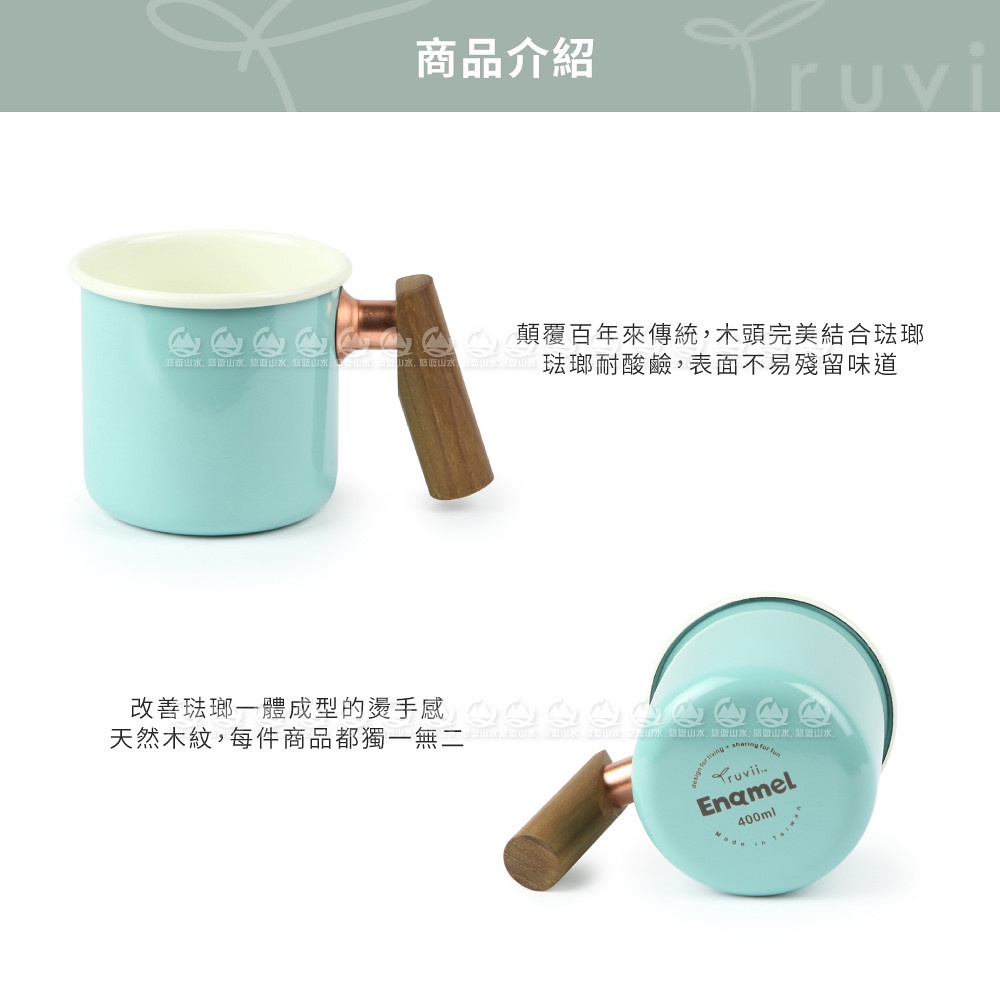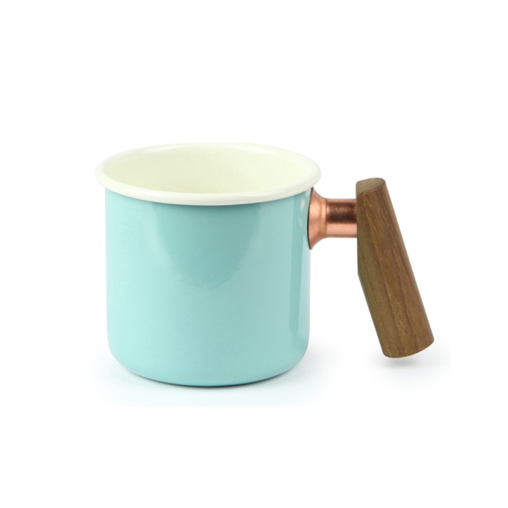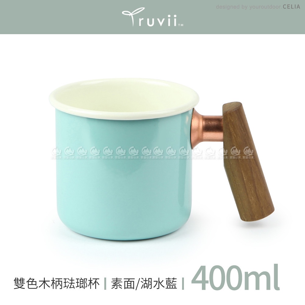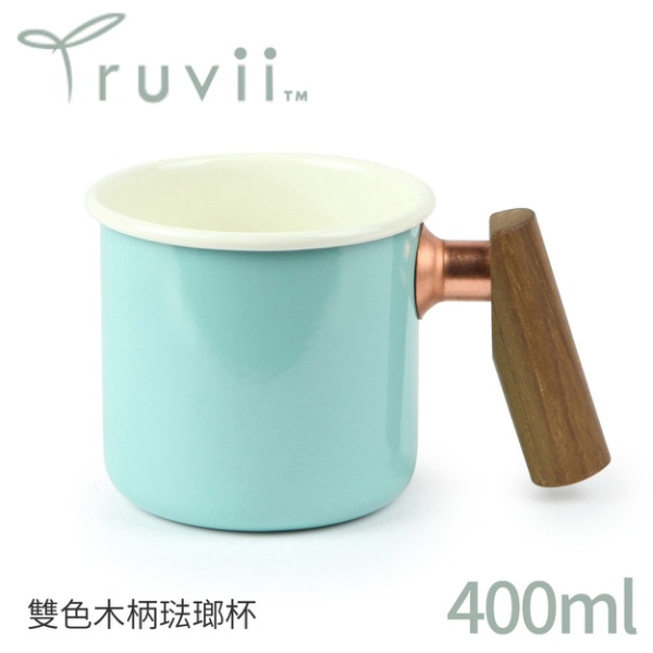 【Truvii 趣味 雙色木柄琺瑯杯 400ml 柚木把手《素面/湖水藍》】1080/馬克杯/露營杯/茶杯/戶外餐具