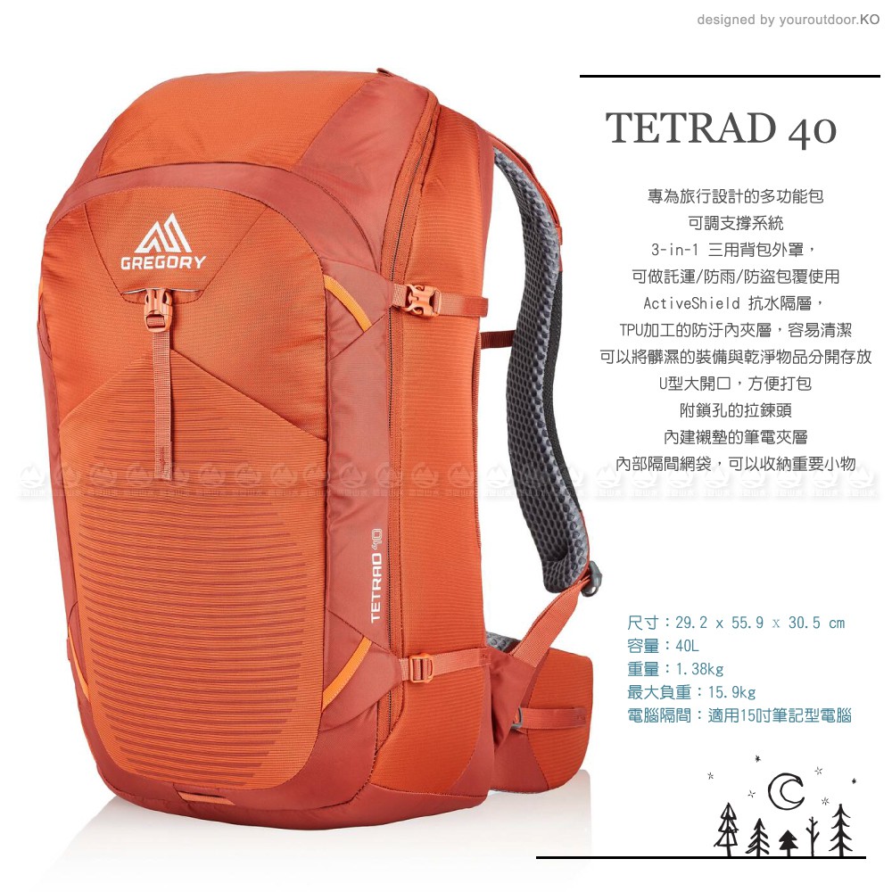 【GREGORY 美國 TETRAD 旅行背包《亞鐵橘》40L】121118/雙肩背包/後背包/登山背包/自助/悠遊山水