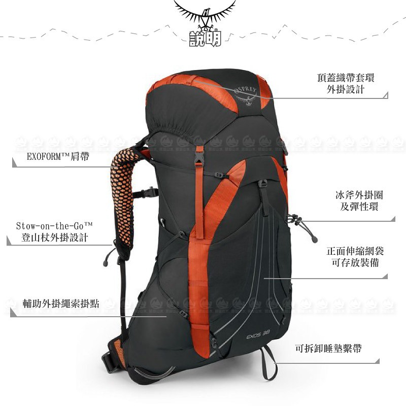 【OSPREY 美國 EXOS 38 M 登山背包《火焰黑》38L】雙肩背包/後背包/登山/健行/旅行/悠遊山水