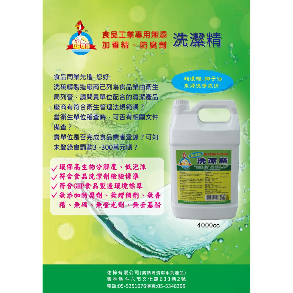 《工廠直營》食品業專用PRO無添加洗潔精【4000cc】無添加化學香精 生鮮處理廠 餐飲、團膳、餐廳