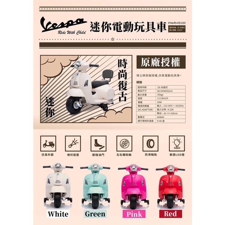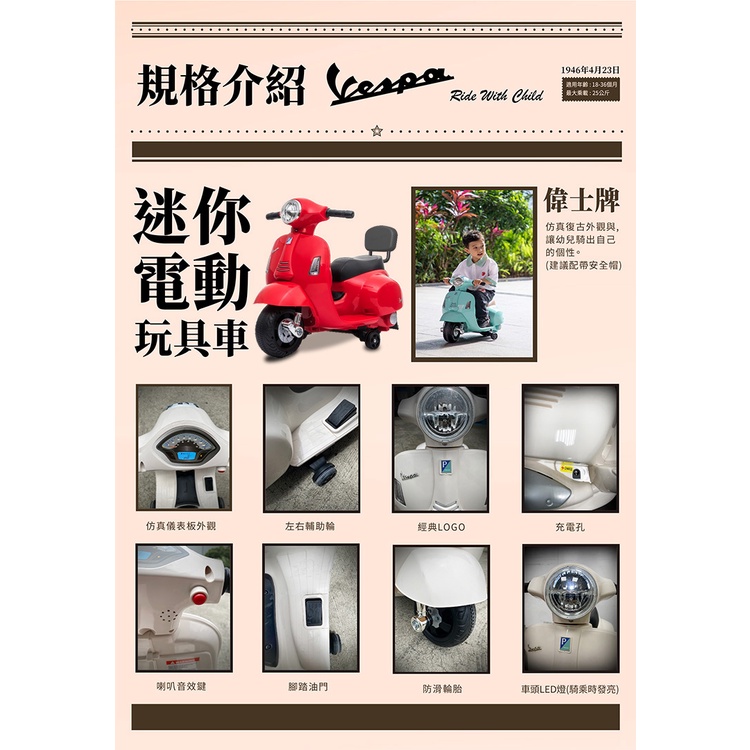 【免運】 義大利【Vespa】迷你電動玩具車靠背款-三色可選