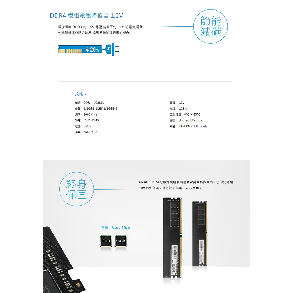 ANACOMDA 巨蟒 DDR4 2666 8GB 桌上型記憶體 UDIMM 有限終身保固 D4 桌機用 記憶體