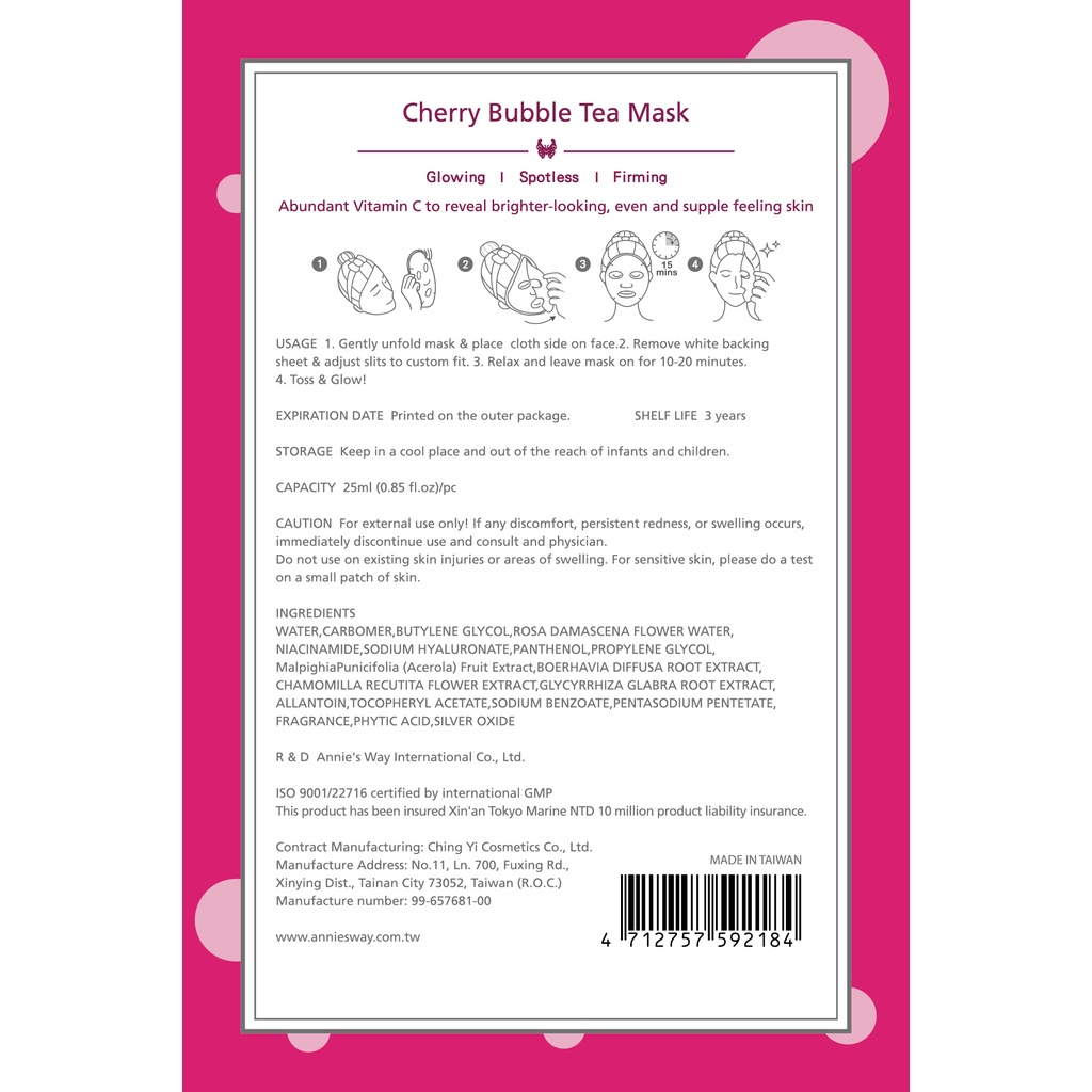 【Annie's Way 安妮絲薇】珍珠奶茶系列—西印度櫻桃嫩白面膜 (5片/盒)