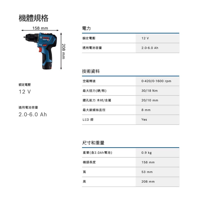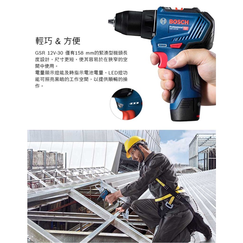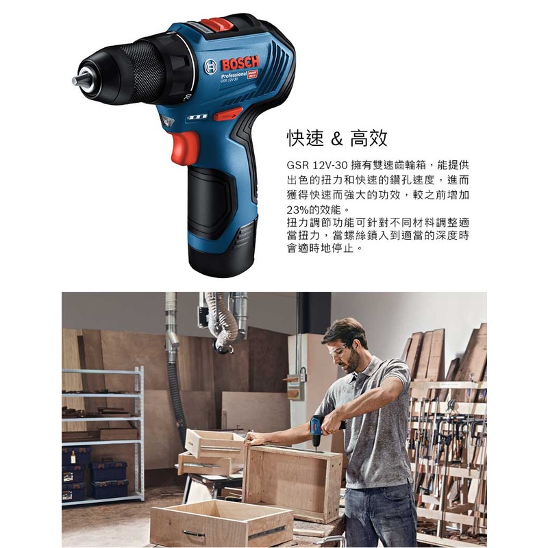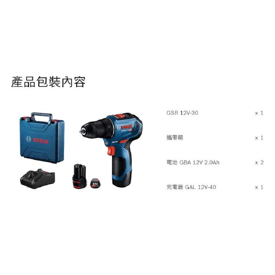 BOSCH 博世 12V 鋰電免碳刷電鑽_起子機 GSR 12V-30 (雙2.0Ah電池)