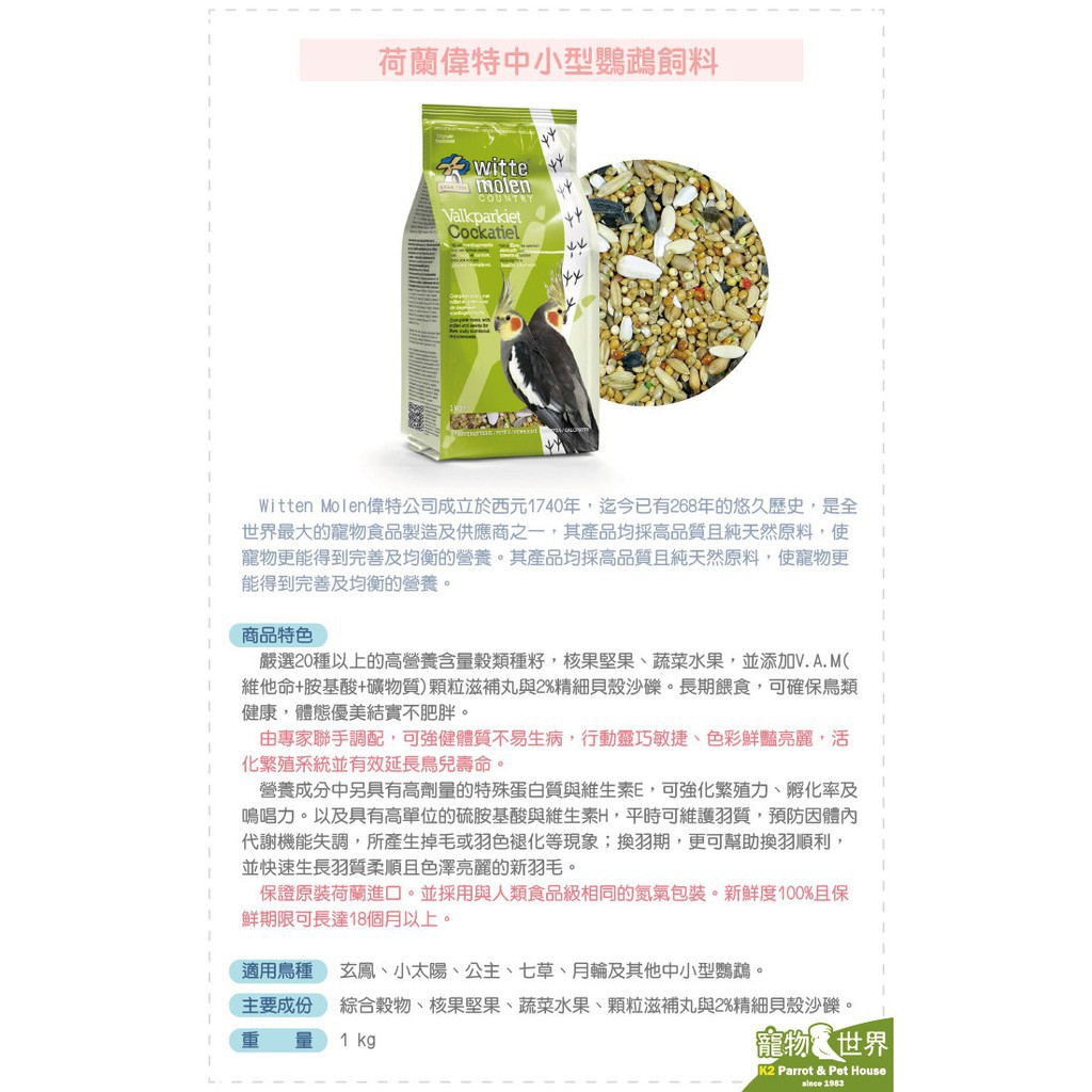 期限2027.04 WitteMolen荷蘭 偉特 中小型鸚鵡飼料1kg│適玄鳳、小太陽、公主、七草、月輪 RB019