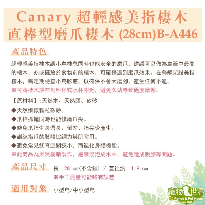 台灣製Canary 超輕感美指棲木-直棒型磨爪棲木(28cm) B-A446 站棒 站棍 小/中小型鳥 GS031
