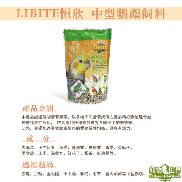 LIBITE恆欣 恒欣 中型鸚鵡飼料1kg│中小型鳥 中型鳥 鸚鵡飼料 鳥飼料《寵物鳥世界》KT006