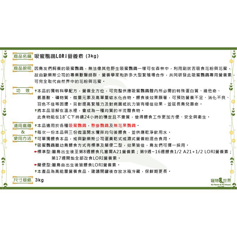 期限2026.10 比利時凡賽爾 歐樂斯 吸蜜鸚鵡LORI營養素3KG│吸蜜粉 吸蜜鸚鵡飼料 《寵物鳥世界》BS001