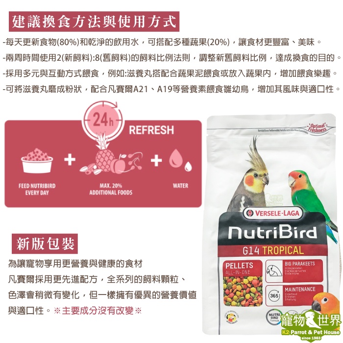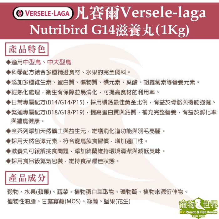 期限2026.08 凡賽爾Versele-Laga歐樂斯Nutribird G14 滋養丸1kg《寵物鳥世界》BS015